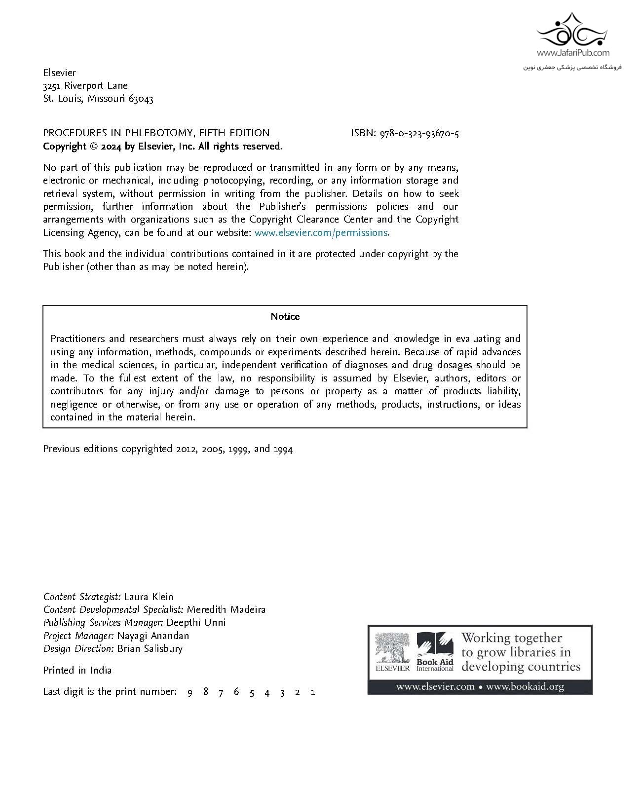 کتاب «روش های خونگیری در فصد خون» ویرایش پنجم، با پوشش مختصر و آسان، دستورالعمل های روشنی برای انجام تکنیک های خونگیری پایه و ویژه ارائه می دهد. این کتاب، روش های مناسب برای خونگیری وریدی، روش های جمع آوری ویژه و ملاحظات کودکان و سالمندان را شرح می دهد و به مباحث ضروری مانند کنترل عفونت، دستورالعمل های OSHA و آناتومی و فیزیولوژی می پردازد. همچنین در مورد مسائل حرفه ای مانند ارتباطات بین فردی، مدیریت بخش، کیفیت کلی و مباحث پزشکی-حقوقی بحث می کند. این نسخه شامل پروتکل های پیشرفته کنترل و پیشگیری از عفونت، پوشش به روز شده قوانین مراقبت های بهداشتی، سوالات مروری گسترده و یک آزمون عملی به روز شده برای آماده سازی شما برای موفقیت در کلاس درس و اخذ گواهینامه است.