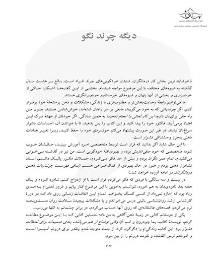 سوالات متداول در مورد خرید کتاب کتاب چرندیاتی که به خود می گویم (چهل راه حل برای رهایی از خودگویی های منفی آزارنده) قیمت این کتاب چقدر است؟ قیمت این کتاب با تخفیف 211,000 تومان است. قیمت بدون تخفیف 215,000 تومان می باشد. این کتاب چه زمانی به دستم می رسد؟ برای کتاب های غیرلاتین، سفارش پس از 1 روز کاری جمع آوری و به پست یا پیک سپرده می شود. اگر مقصد تهران باشد و روش پیک انتخاب شود، در روزهای غیر تعطیل و ساعات کاری همان روز ارسال انجام می شود.