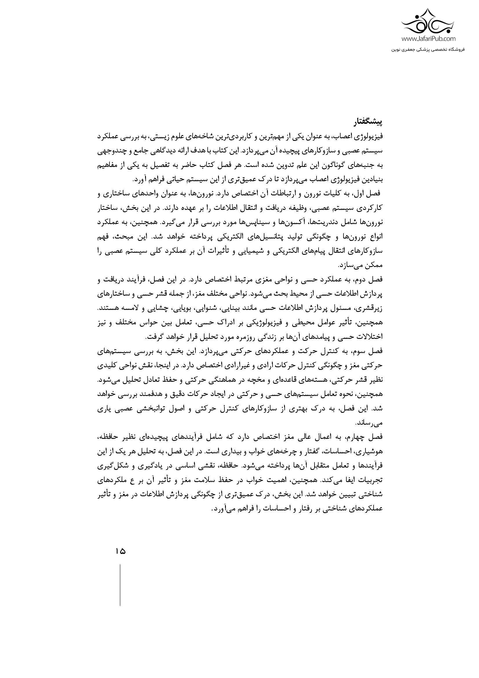 سوالات متداول در مورد خرید کتاب فیزیولوژی اعصاب و حس ویژه قیمت این کتاب چقدر است؟ قیمت این کتاب با تخفیف 247,000 تومان است. قیمت بدون تخفیف 260,000 تومان می باشد. این کتاب چه زمانی به دستم می رسد؟ برای کتاب های غیرلاتین، سفارش پس از 1 روز کاری جمع آوری و به پست یا پیک سپرده می شود. اگر مقصد تهران باشد و روش پیک انتخاب شود، در روزهای غیر تعطیل و ساعات کاری همان روز ارسال انجام می شود.