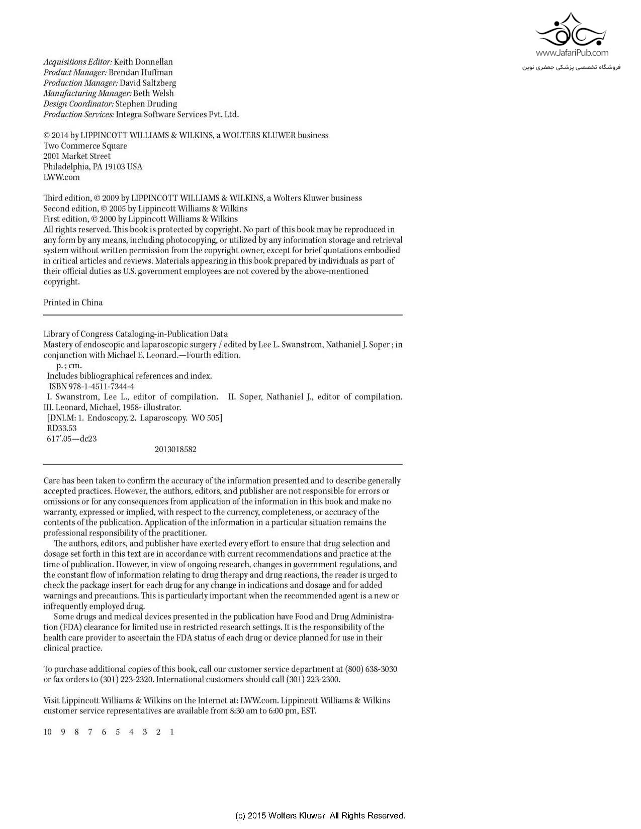 سوالات متداول در مورد خرید کتاب Mastery of Endoscopic and Laparoscopic Surgery Fourth Edition قیمت این کتاب چقدر است؟ قیمت این کتاب بسته به نوع جلد و نسخه متفاوت است و از 2,533,000 تومان شروع می شود. در حال حاضر با تخفیف 2,279,700 تومان عرضه می شود. این کتاب چه زمانی به دستم می رسد؟ برای کتاب های انگلیسی یا لاتین، زمان تحویل بین 3 تا 6 روز کاری است.
