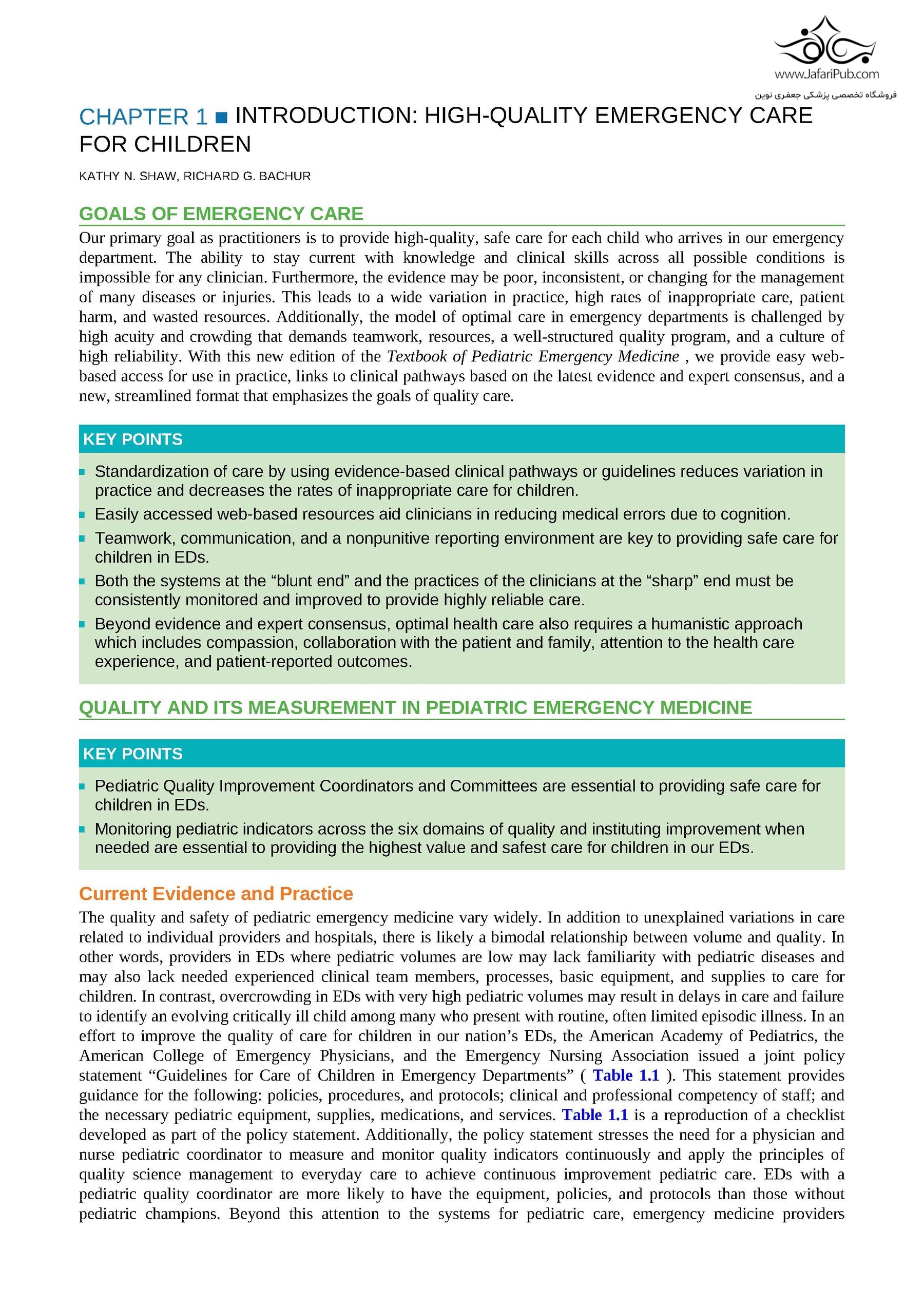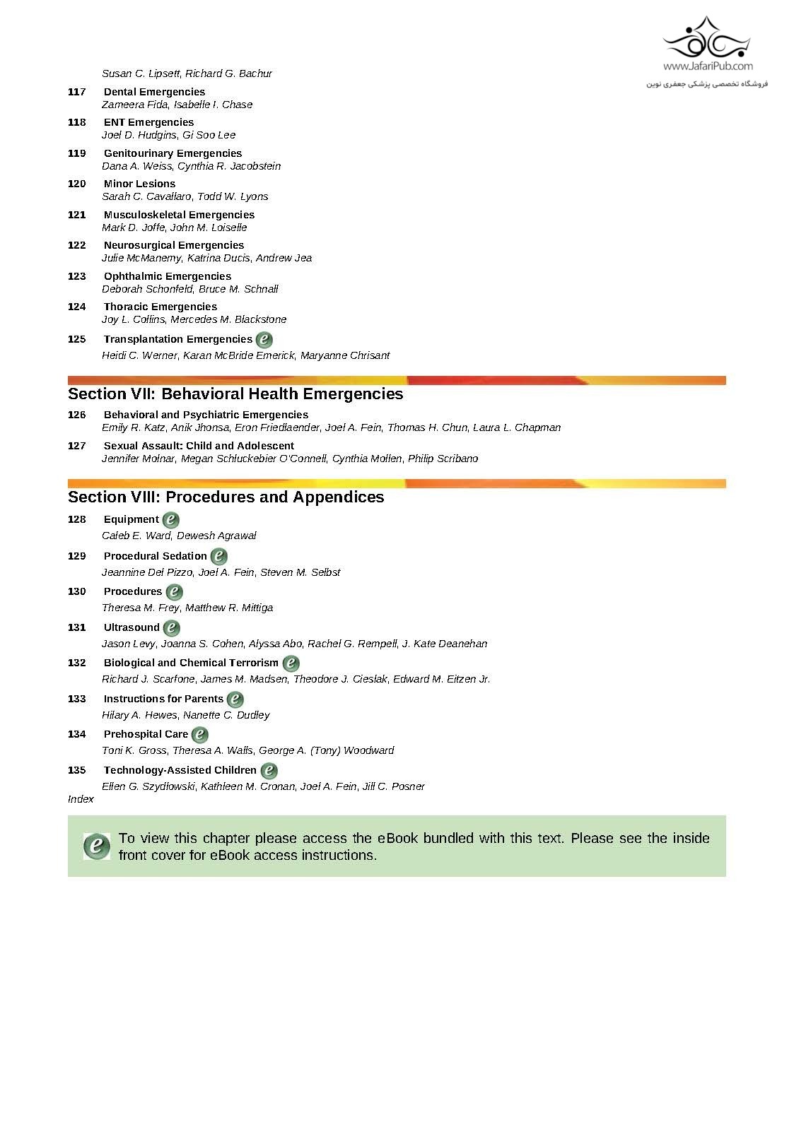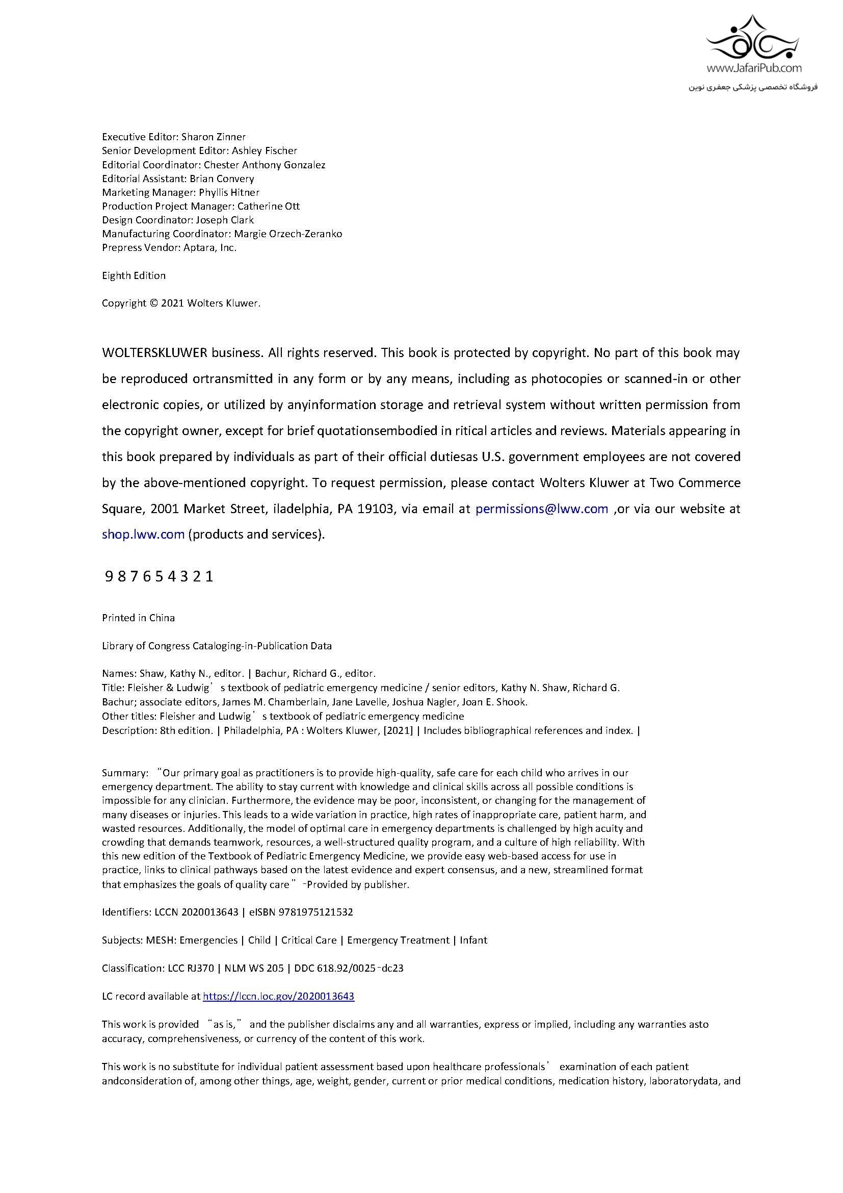 ong considered the gold standard comprehensive reference for diagnosing and managing emergent health issues in children, Fleisher & Ludwig's Textbook of Pediatric Emergency Medicine is an essential resource for clinicians at all levels of training and experience. The revised eighth edition has been updated from cover to cover, providing practical, evidence-based content to help you meet any clinical challenge in the emergency care of pediatric patients. Streamlines content for quick reference, focusing on patient and practitioner safety, essential pathophysiology, clear outcomes and triage considerations, and efficient cross-referencing between chapters.Presents the knowledge and expertise of numerous new contributorsIncludes new chapters on clinical pathways, clinical decision and support, multidisciplinary teamwork, and the importance of humanism in emergency medicine. Contains easy-to-follow algorithms, online links to The Children's Hospital of Philadelphia's clinical pathways for managing critical patients, and clinical pearls throughout.Features an extensive signs and symptoms section, plus sections on resuscitation and stabilization, medical emergencies, trauma, surgical emergencies, and behavioral health emergencies.Includes helpful chapters on biological and chemical terrorism, equipment, parental instructions, procedures, and much more. Enrich Your eBook Reading ExperienceRead directly on your preferred device(s), such as computer, tablet, or smartphone.Easily convert to audiobook, powering your content with natural language text-to-speech.