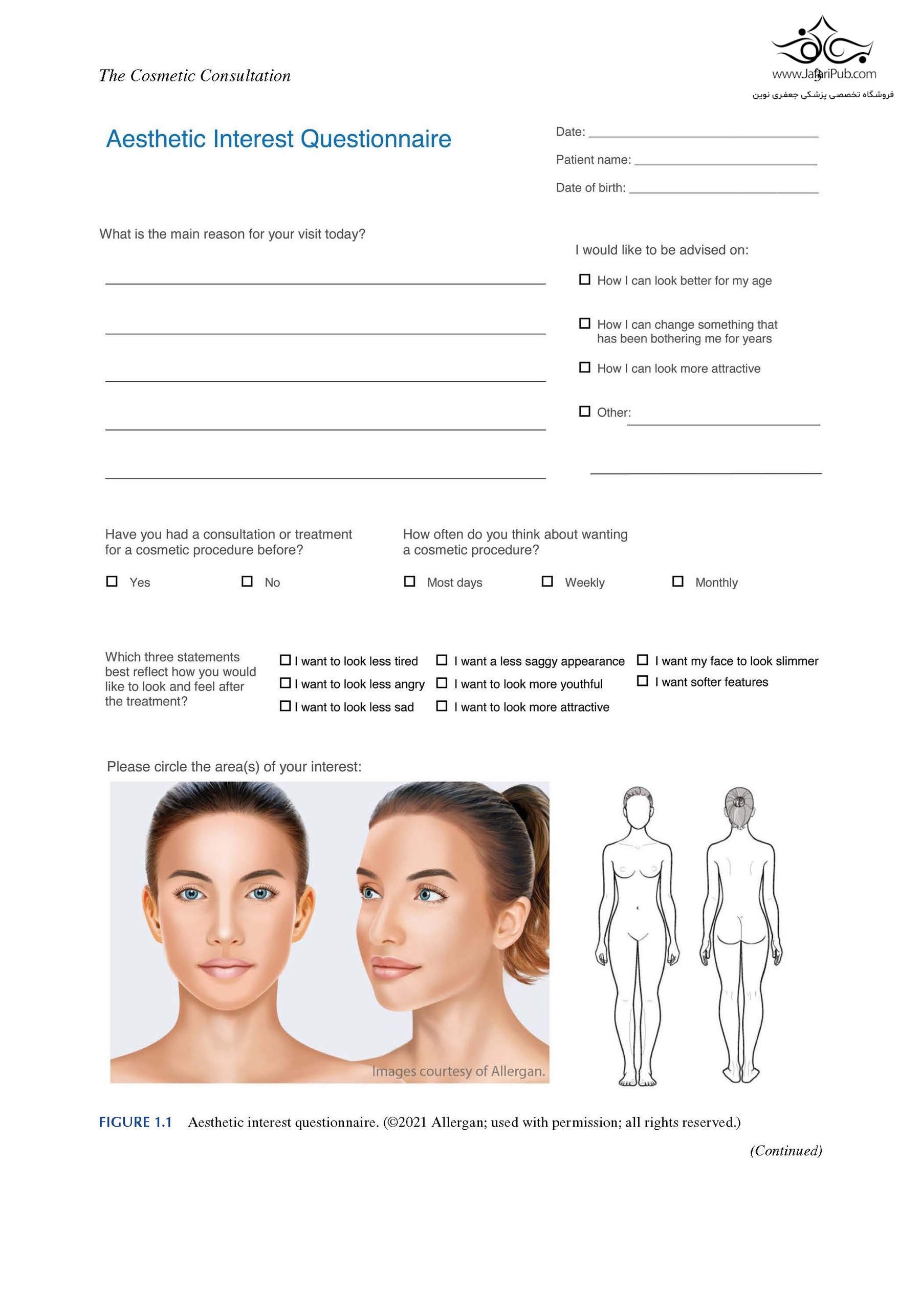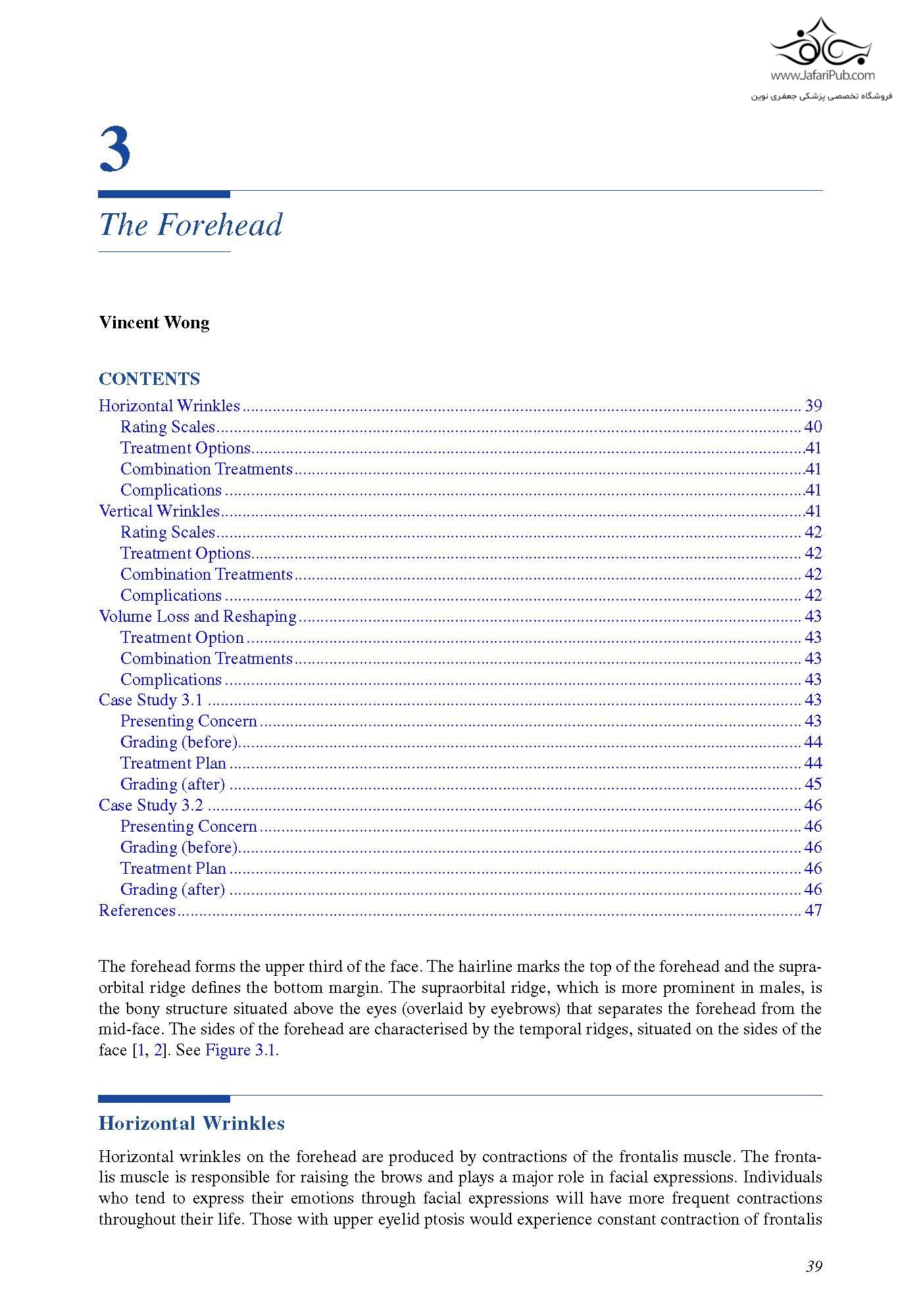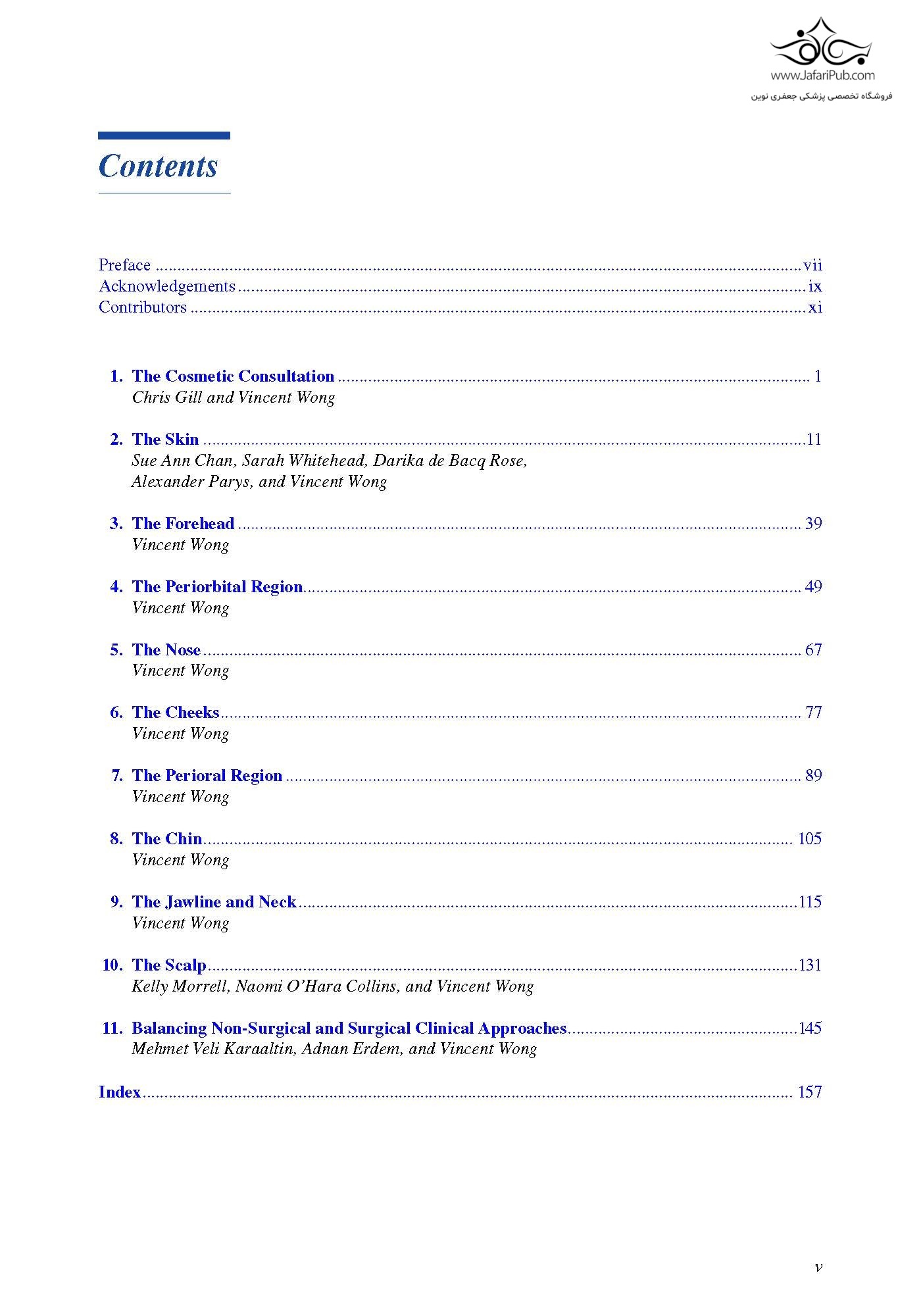 محتویات: مشاوره زیبایی * پوست * پیشانی * ناحیه اطراف چشم * بینی * گونه * ناحیه اطراف دهان * چانه * خط فک و گردن * پوست سر * متعادل کننده رویکردهای بالینی غیر جراحی و جراحی
