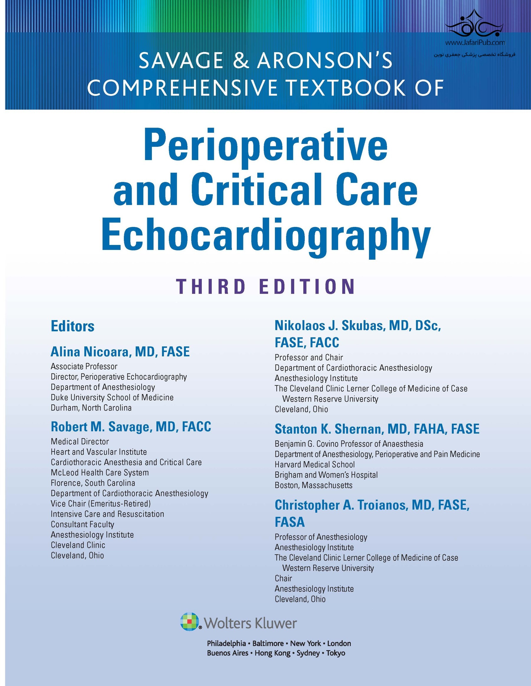 کتاب درسی جامع اکوکاردیوگرافی حین عمل و مراقبت های حیاتی ساوج و آرونسون که به طور کامل برای انعکاس پیشرفت های جدید در این زمینه تجدید نظر شده است، متن و مرجع قطعی اکوکاردیوگرافی ترانس مری (TEE) باقی مانده است. ویرایش شده توسط Drs. Alina Nicoara، Robert M. Savage، Nikolaos J. Skubas، Stanton K. Shernan، و Christopher A. Troianos، این مرجع معتبر مطالب مربوط به تمرینات بالینی روزانه در اتاق های عمل و مناطق رویه ای، آماده سازی برای معاینات صدور گواهینامه، استفاده از اکوکاردیوگرافی را در بر می گیرد. تنظیمات مراقبت های ویژه و برنامه های کاربردی پیشرفته مربوط به گواهینامه و دستورالعمل های عملی فعلی.