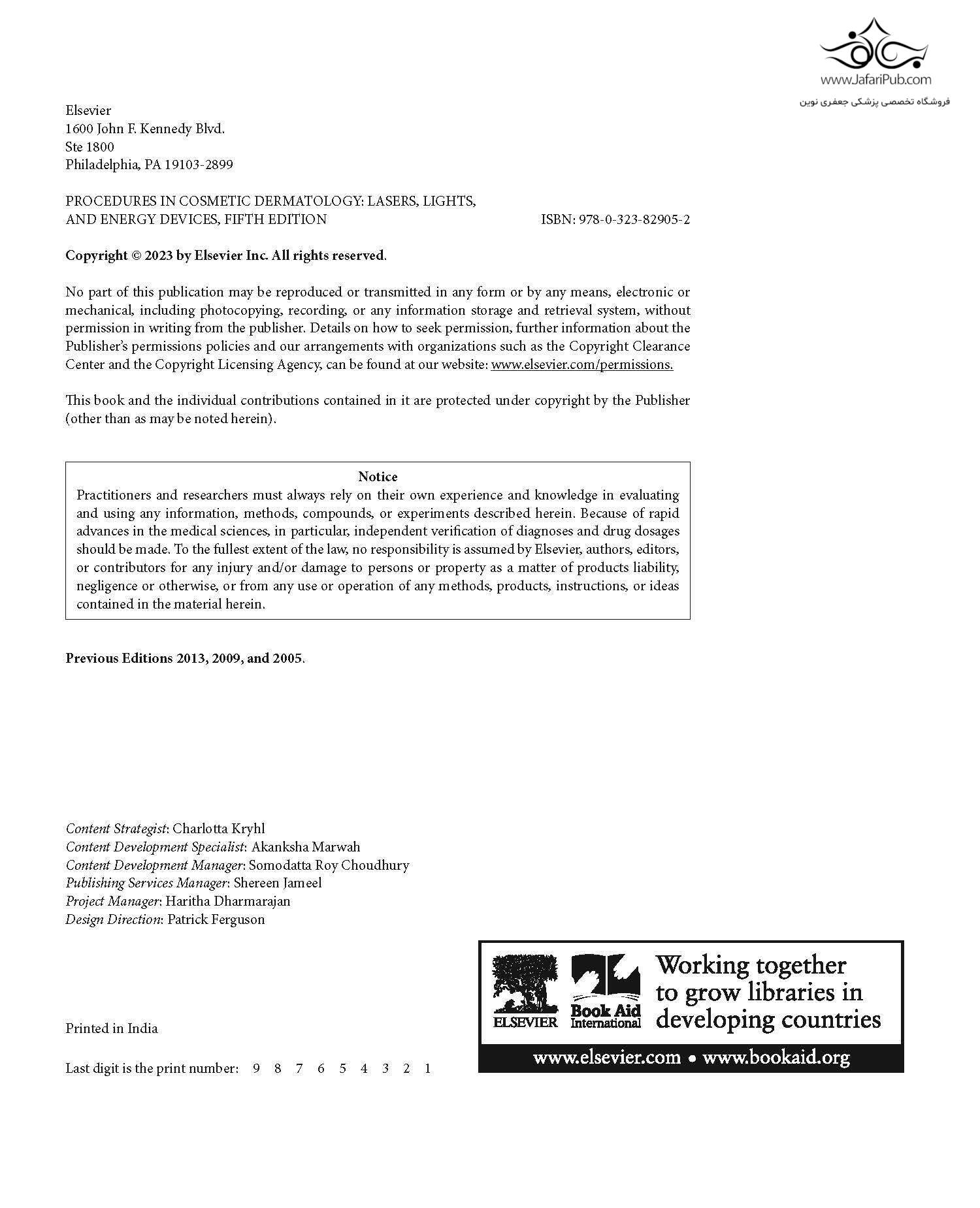 ارائه یک رویکرد گام به گام و عملی به این حوزه چالش برانگیز پوست، رویه های درماتولوژی زیبایی: لیزر، نور و دستگاه های انرژی، ویرایش پنجم، شما را قادر می سازد تا بر تکنیک های آرایشی به روز تسلط داشته باشید که نتایج عالی را ایجاد می کند. بیماران شما انتظار دارند ویرایش شده توسط پزشکان متخصص Drs. Elizabeth L. Tanzi، Jeffrey S. Dover و Leah K. Spring، مروری بر اصول علمی زیربنایی لیزرها و نورها در پوست، و همچنین آخرین گزینه های درمانی را ارائه می کند که همگی به وفور نشان داده شده اند و بر اساس شواهد و مدارک هستند. یک کتابخانه ویدیویی قابل توجه که کاربردها و جنبه های فنی را نشان می دهد به شما کمک می کند تا با موفقیت آخرین رویه ها را در عمل خود بگنجانید. راهنمایی معتبر و معتبر در مورد روش های رایج از جمله حذف موهای زائد با لیزر، حذف خالکوبی، ضایعات عروقی، ضایعات رنگدانه ای، جوان سازی لیزر فرکشنال غیر سایشی، لایه برداری با لیزر فرسایشی، سفت کردن بافت ها و کانتور کردن بدن ارائه می کند. شامل پنج فصل جدید: درمان پوست با منابع نور پالسی شدید، میکرونیدلینگ رادیوفرکوئنسی، فتودینامیک تراپی، تقویت عضلات و کانتورینگ، و درمان آکنه با دستگاه های مبتنی بر نور و انرژی. دارای یک کتابخانه ویدیویی بسیار گسترده با بیش از سه دوجین ویدیوی جدید، که روش هایی مانند درمان فوتودینامیک، IPL، میکرونیدلینگ رادیوفرکوئنسی، طیف وسیعی از لیزرها و کرایولیپولیز را نشان می دهد. ملاحظات خاص هنگام درمان پوست رنگی و همچنین عوارض و ملاحظات قانونی لیزر، نور و درمان های مبتنی بر انرژی را پوشش می دهد. شامل روش های رویه ای، مشاوره گام به گام در مورد تکنیک های مناسب، مطالعات موردی، و مرواریدها و مشکلات است. نسخه کتاب الکترونیکی پیشرفته همراه با خرید. کتاب الکترونیکی پیشرفته شما به شما امکان می دهد به تمام متن ها، شکل ها و مراجع کتاب در دستگاه های مختلف دسترسی داشته باشید.