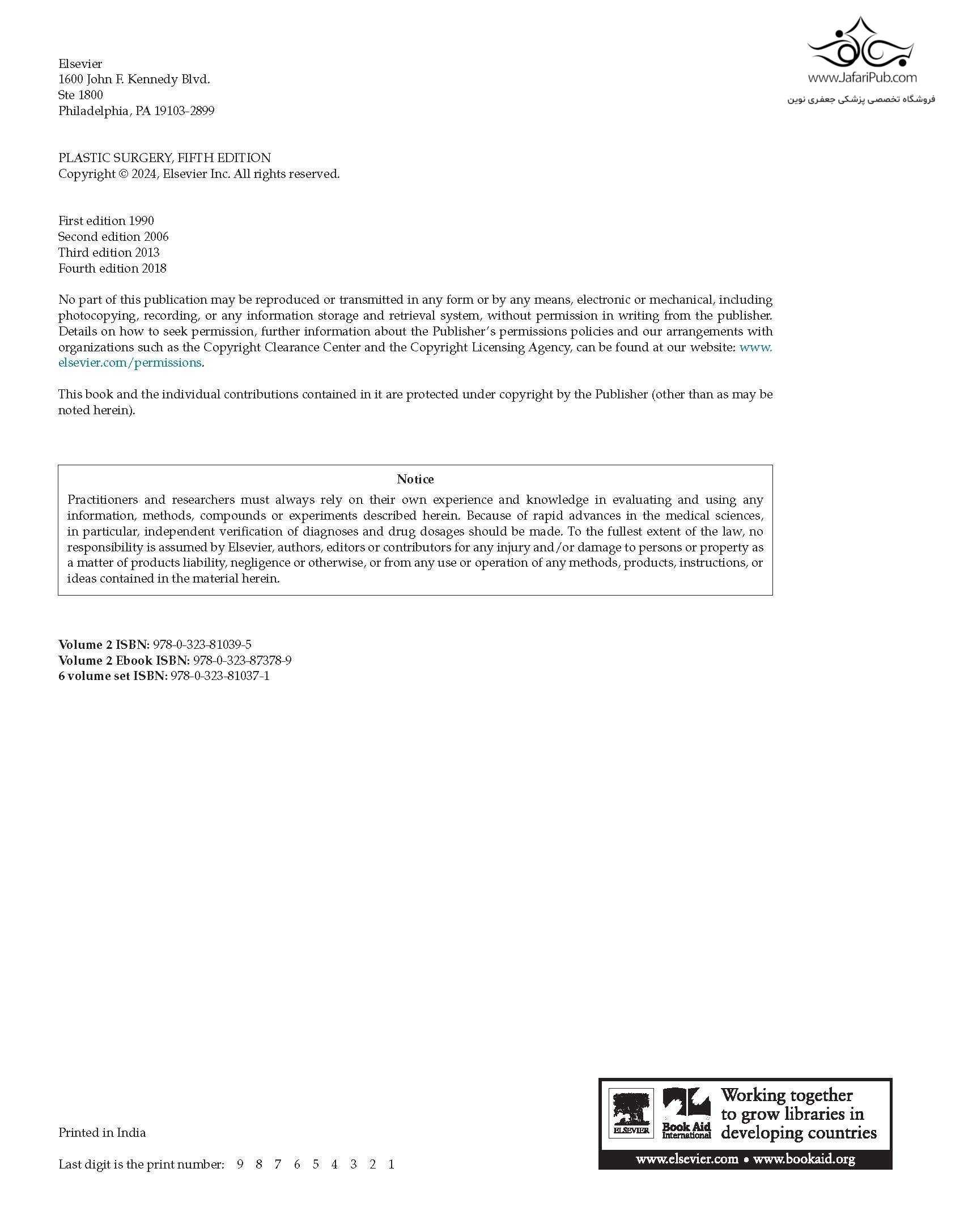 جراحی پلاستیک شش جلدی جامع و کاملاً به روز، متن استاندارد طلایی در این حوزه پیچیده جراحی است. به طور کامل برای پاسخگویی به خواسته های کارآموز و جراح با تجربه، اصول، جلد 1 جراحی پلاستیک، ویرایش پنجم، دارای عکس های بالینی تمام رنگی جدید، ویدئوهای رویه ای، سخنرانی ها و پوشش معتبر موضوعات داغ در این زمینه است. ارائه های ویدیویی روایت شده توسط ویرایشگر، گام به گام تکنیک ها و رویه ها را به صورت صوتی و تصویری ارائه می کنند.