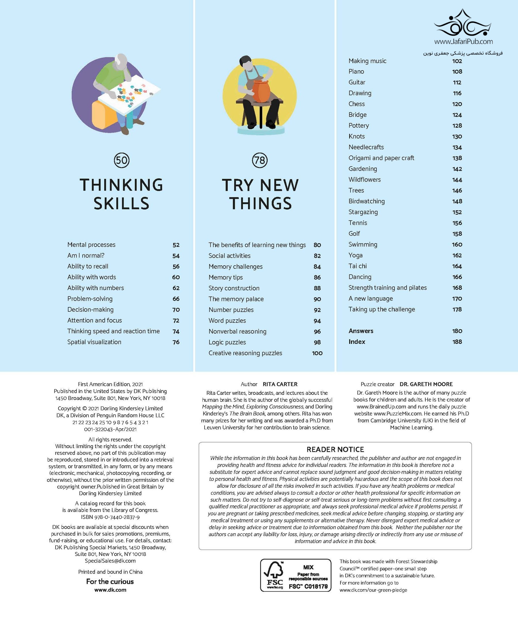 این کتاب با تمرینات مغز، پازل های منطقی و نقشه های ذهنی، راهنمای متعادل، واضح، رنگارنگ و عملی برای تناسب اندام مغز شما ارائه می دهد. همچنین شامل معرفی گام به گام فعالیت های مختلف از نواختن گیتار تا شروع یوگا و تای چی می شود تا به شما در حفظ تناسب، سلامت و جوانی مغزتان کمک کند.