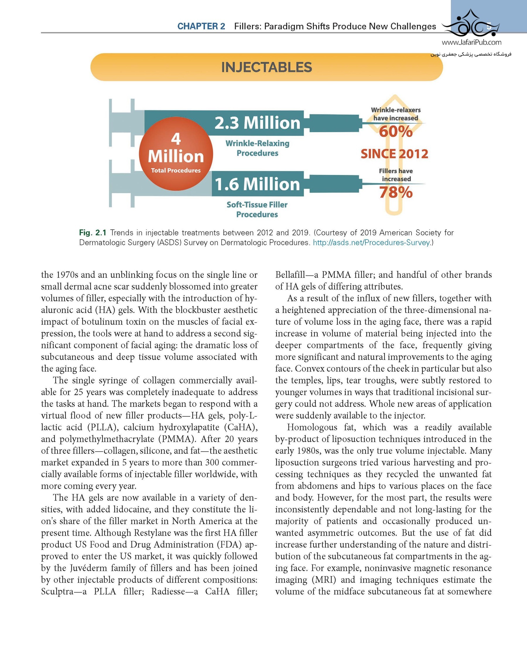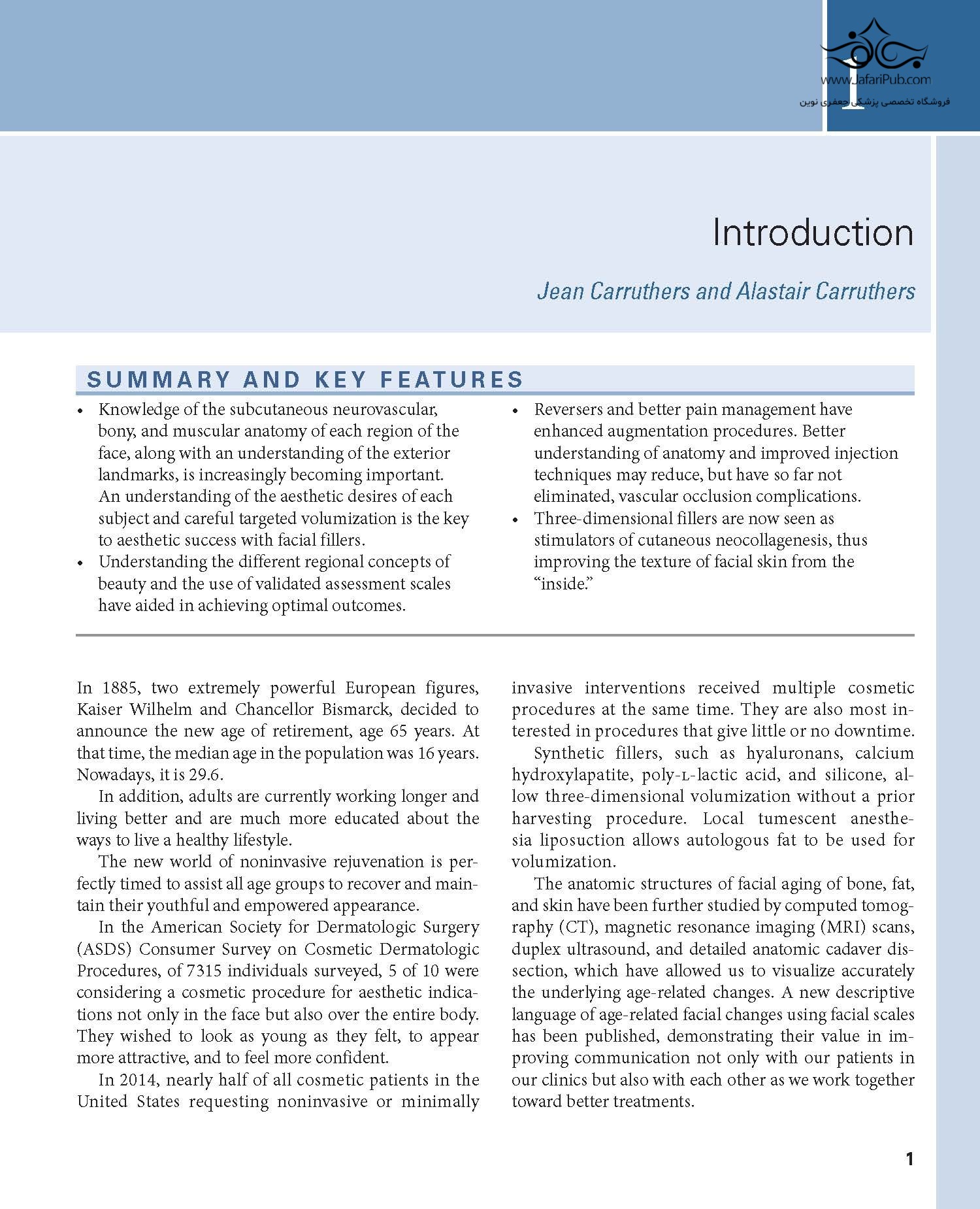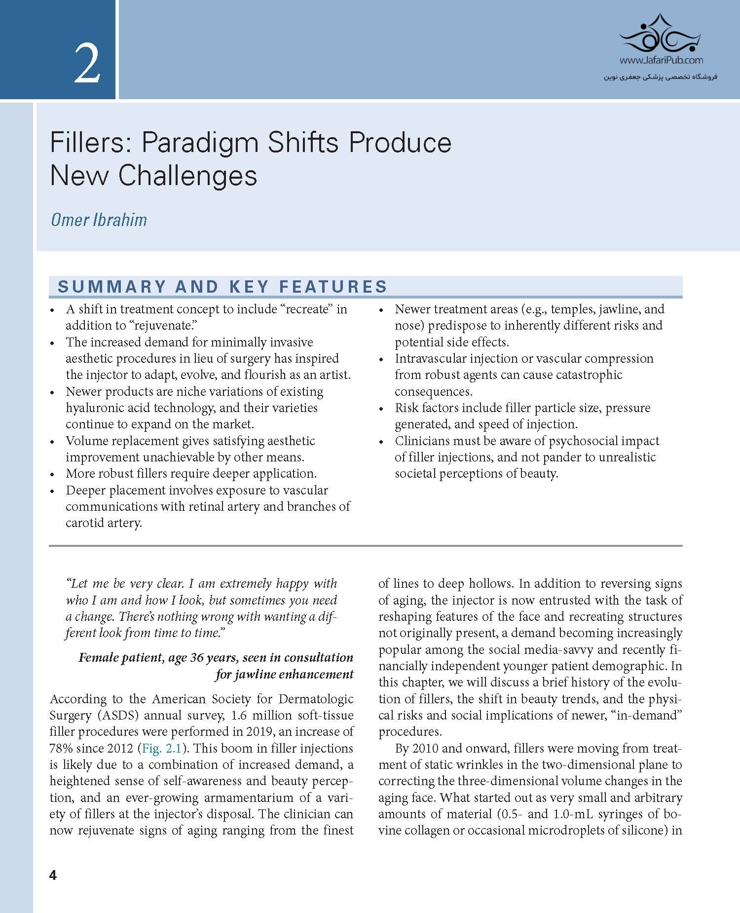 توضیحات و دلایل کامل و واضحی برای استفاده از فیلرهای پوستی برای مقابله با از دست دادن چربی صورت، عضلات و تراکم استخوان ارائه می دهد. محتوای منطقی سازماندهی شده با تکنیک های تزریق عمومی و ملاحظات صورت آغاز می شود و پس از آن گزینه های متعددی از مواد فیلر و فصل هایی برای هر ناحیه درمان ارائه می شود.