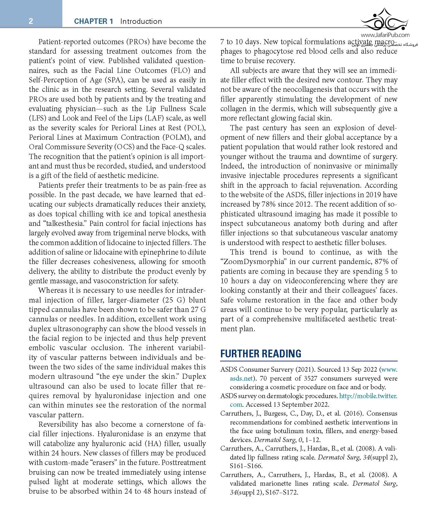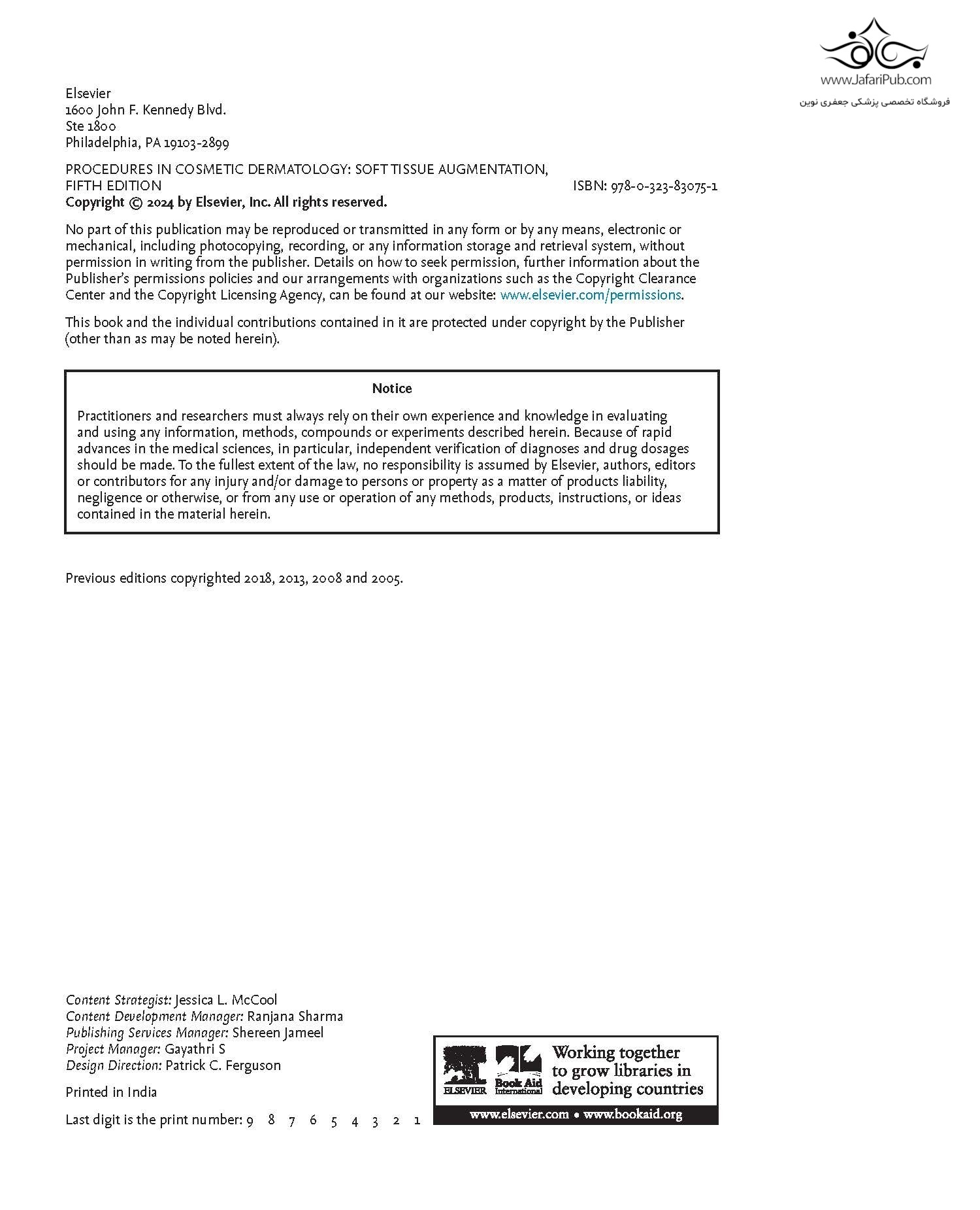 کتاب «روش های پوست شناسی زیبایی: تقویت بافت نرم، ویرایش پنجم» با ارائه یک رویکرد گام به گام و عملی برای روش های زیبایی پرطرفدار، شما را قادر می سازد تا بر تکنیک های آرایشی به روز که نتایج برتر مورد انتظار بیماران شما را ایجاد می کنند، تسلط یابید. این کتاب که توسط پزشکان متخصص، دکتر ژان کاروترز و آلیستر کاروترز، به همراه جفری اس. دوور، مراد عالم و عمر ابراهیم ویرایش شده است، انواع مختلف فیلرها از جمله نحوه انتخاب فیلر، نواحی درمان بر اساس محل، شامل تکنیک های مختلف تزریق و برگشت نتایج، و همچنین یک بخش کامل در مورد عوارض - که همگی به طور کامل مصور و مبتنی بر شواهد هستند - را پوشش می دهد. یک کتابخانه ویدیویی قابل توجه به شما کمک می کند تا با موفقیت جدیدترین روش ها را در عمل خود بگنجانید.