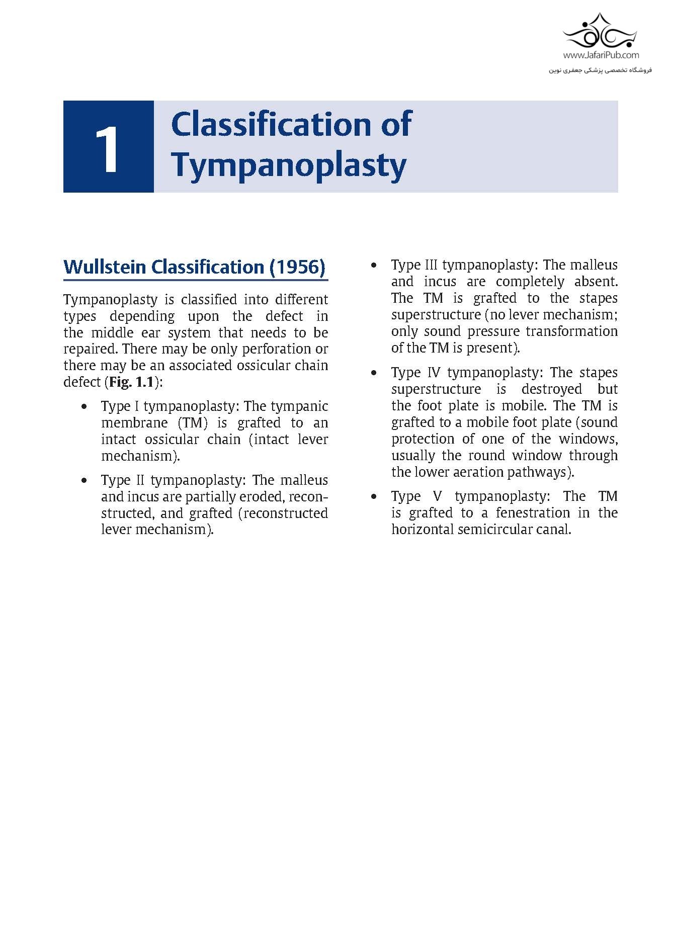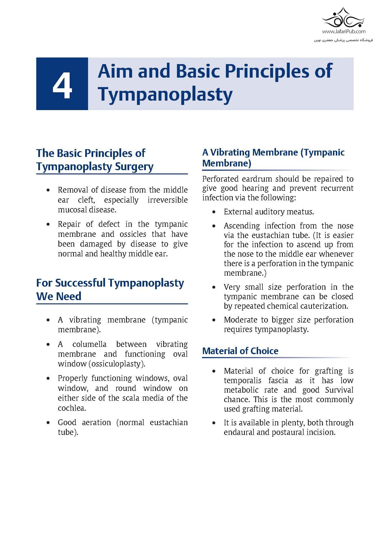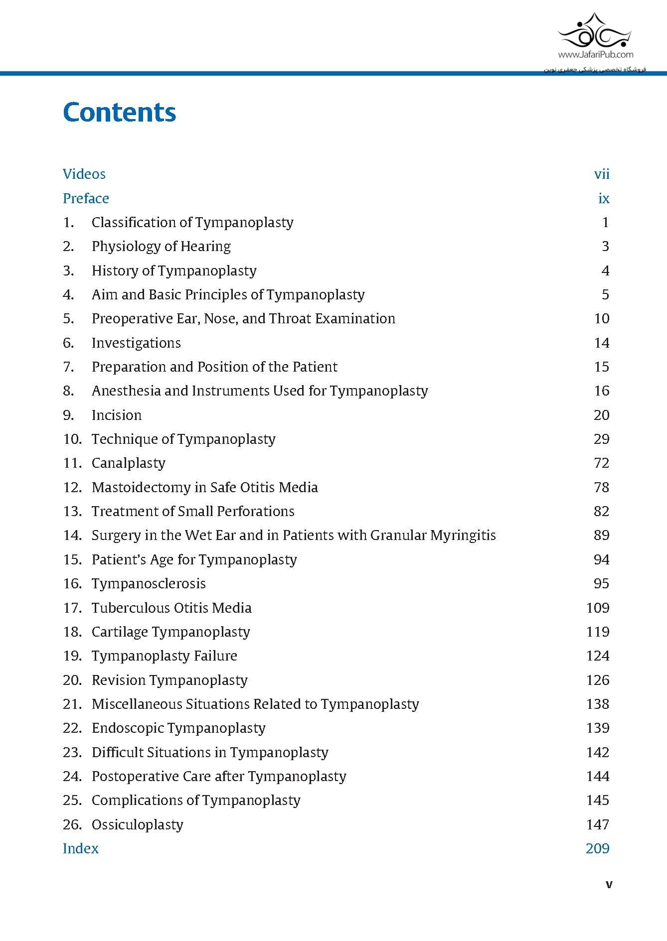 تکنیک های مختلف تمپانوپلاستی به ویژه تکنیک زیر کاف کامل 360 درجه، اهمیت جراحی کانال و ماستوئیدکتومی، تمپانوپلاستی در گوش مرطوب، شرایط دشوار در تمپانوپلاستی، علل شکست تمپانوپلاستی و تمپانوپلاستی تجدیدنظر.