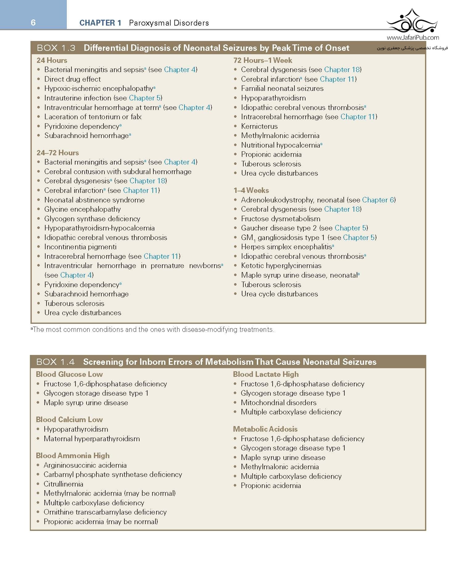 دارای جداول تشخیص افتراقی وزن دار و الگوریتم های درمانی است که به شما کمک می کند تا به سرعت شایع ترین و قابل درمان ترین اختلالات عصبی را شناسایی کنید، و همچنین سخت ترین اختلالات تخریب کننده عصبی، از جمله موارد ناشی از خطاهای ذاتی متابولیسم را ارزیابی و مدیریت کنید.