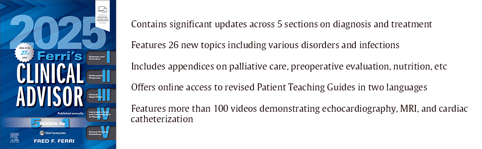 For more than 25 years, Ferri’s Clinical Advisor has provided immediate answers on the myriad medical diseases and disorders you’re likely to encounter in a unique, easy-to-use format. A bestselling title year after year, this popular "5 books in 1" reference delivers vast amounts of information in a user-friendly manner. It is updated annually to provide current and clinically relevant answers on over 1,000 common medical conditions, including diseases and disorders, differential diagnoses, clinical algorithms, laboratory tests, and clinical practice guidelines―all carefully reviewed by experts in key clinical fields. Extensive algorithms, along with hundreds of high-quality photographs, illustrations, diagrams, and tables, ensure that you stay current with today's medical practice.