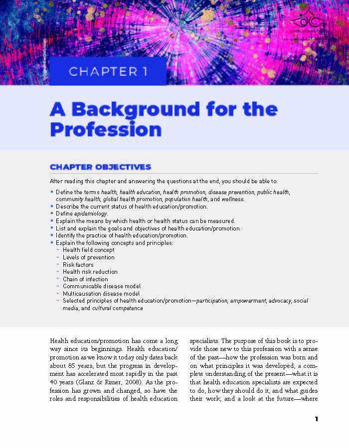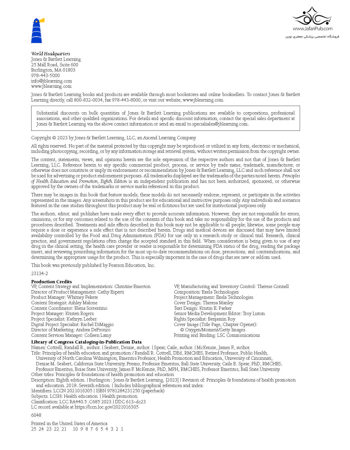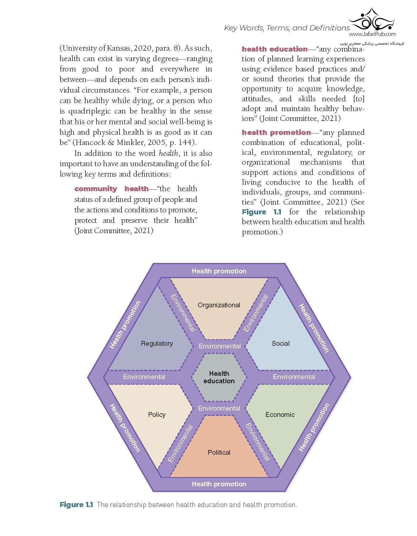 اصول آموزش و ارتقای سلامت پایه و اساس محکمی در تاریخ، فلسفه، نظریه و اخلاق آموزش سلامت در اختیار خوانندگان قرار می دهد. این متن که بهترین مقدمه کلی برای حوزه رو به رشد آموزش و ارتقای سلامت در نظر گرفته می شود، موضوعات اساسی را به تحقیقات، منابع و پزشکان مرتبط می کند. نقش ها و مسئولیت های متخصصان آموزش بهداشت، محیط های شغلی بالقوه، و اخلاقیاتی که تصمیمات حرفه ای را تعیین می کند را پوشش می دهد. با نگاهی به گذشته، حال و آینده بهداشت، مراقبت های بهداشتی و آموزش و ارتقای سلامت، این کتاب شامل بحث هایی در مورد اصلاحات اخیر سلامت، چشم انداز حرفه ای در حال تکامل، استفاده از رسانه های اجتماعی در ارتقای سلامت و موارد دیگر است.
