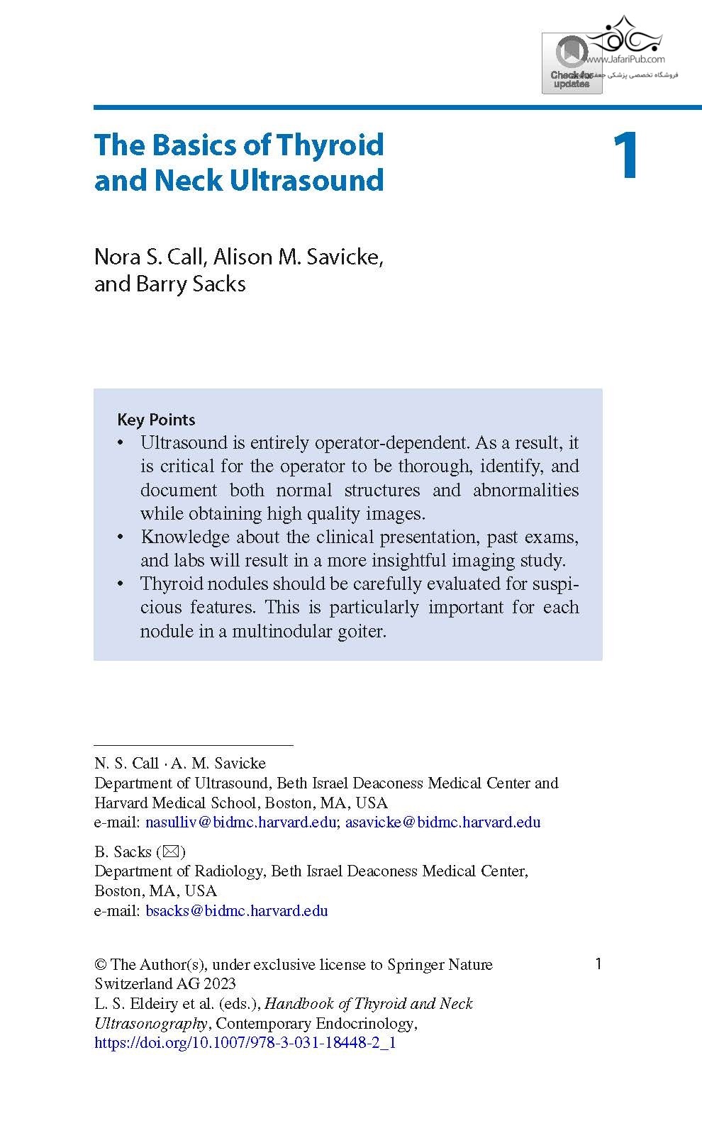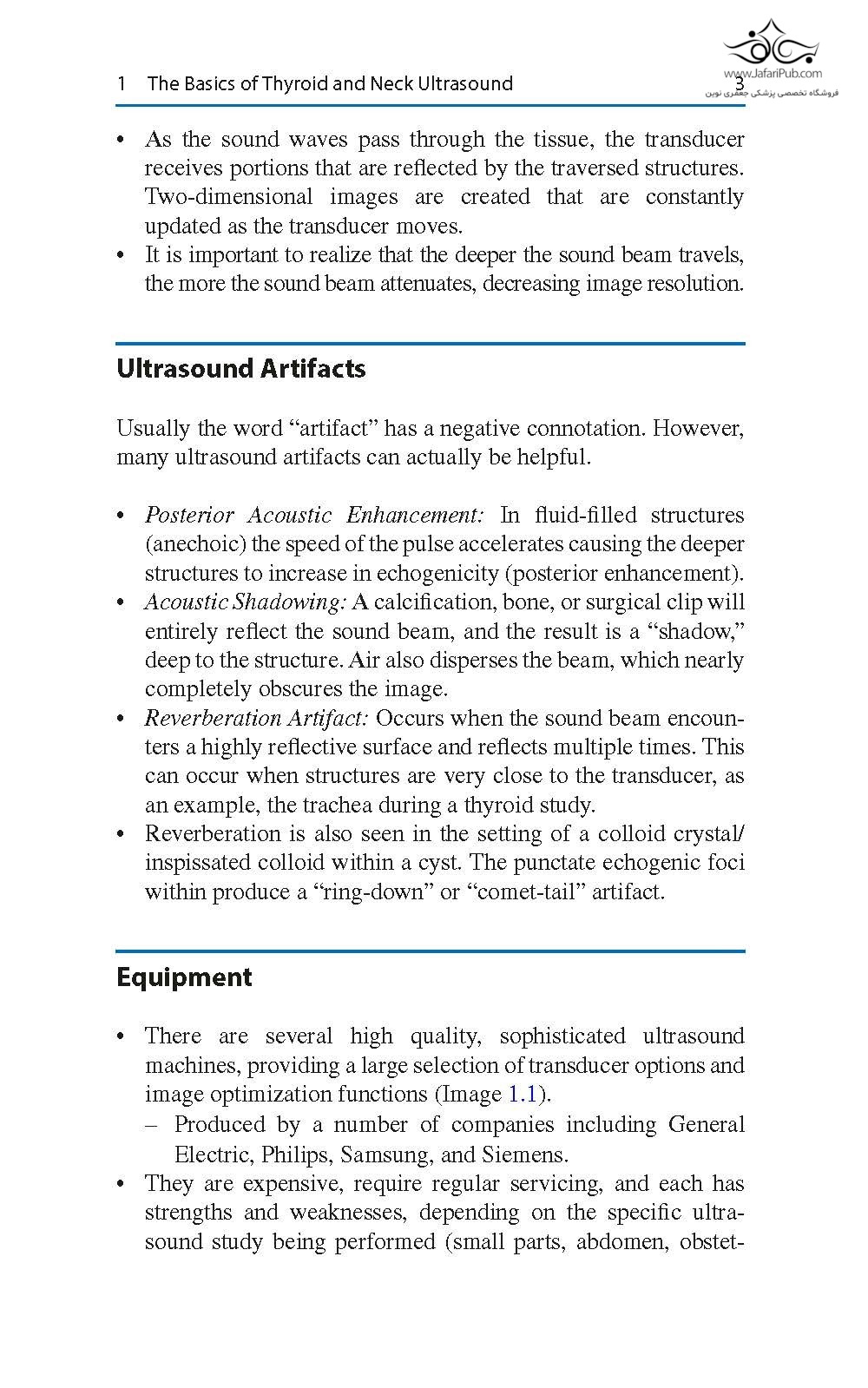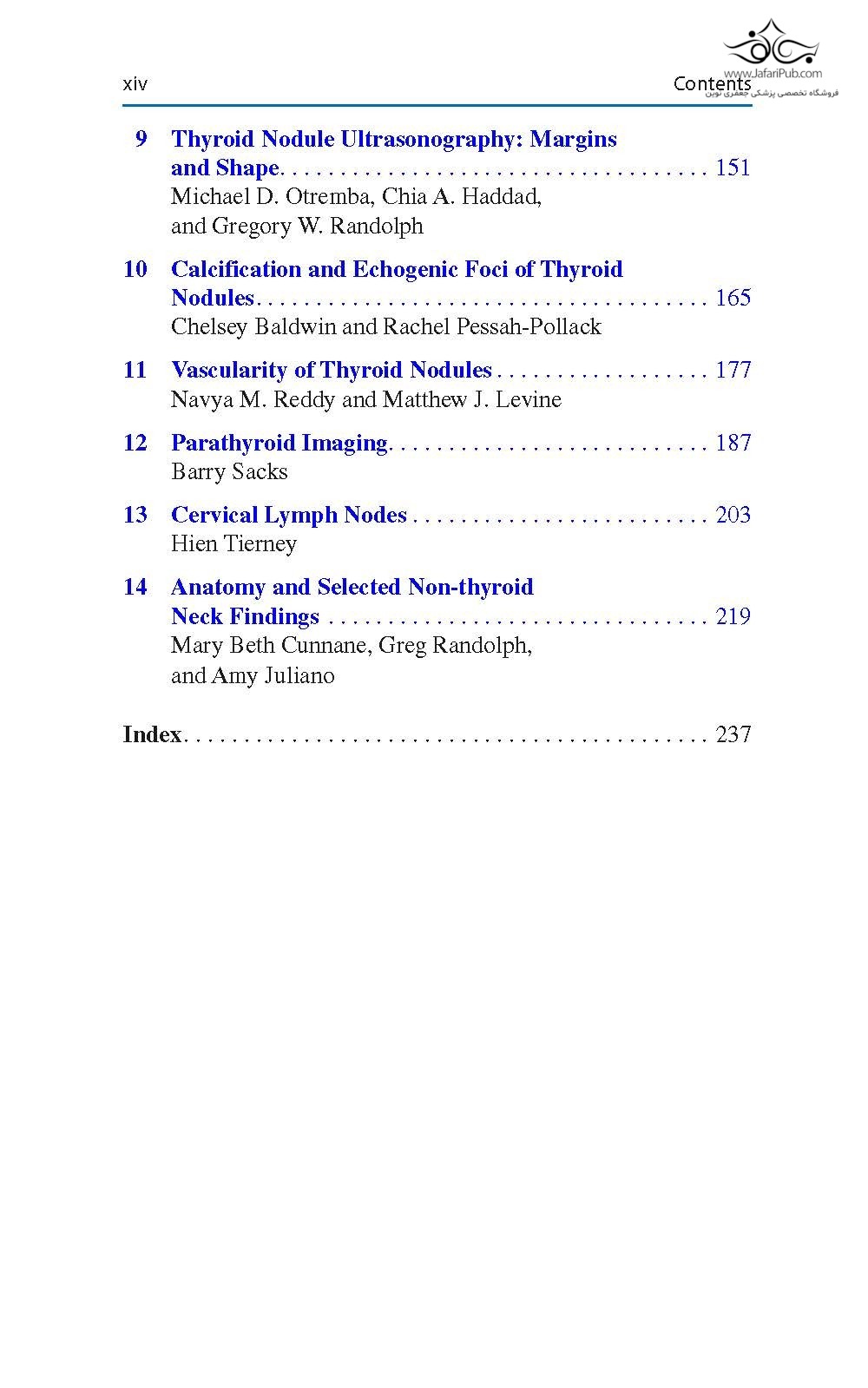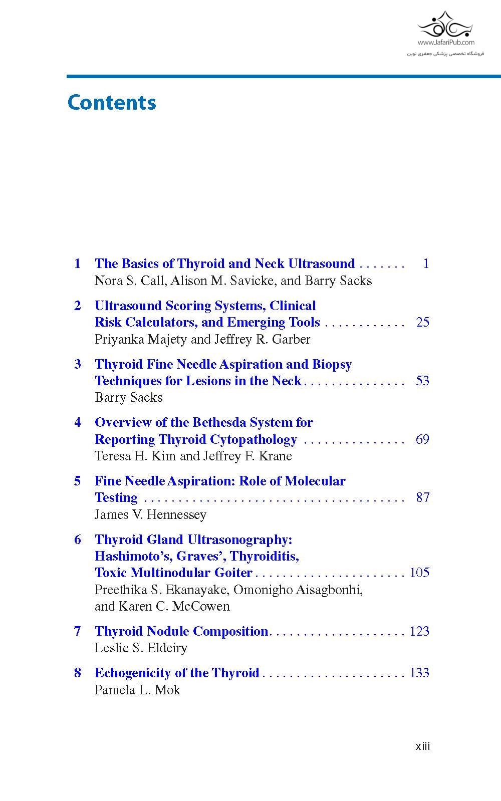 این کتابچه کاربردی یک خلاصه موردی بر اساس الگوهای سونوگرافی تیروئید و گردن است که معمولاً در عمل بالینی با آن مواجه می شویم. یک فصل برای هر یک از انواع اصلی ویژگی های اولتراسوند ندول تیروئید و فصل های اضافی برای سایر ضایعات گردن غیر تیروئید تعیین می شود. با شروع نمونه های تصویربرداری (عکاسی) از هر یک از یافته های اولتراسوند، موارد بالینی برای تقسیم بندی هر ویژگی و نشان دادن تشخیص های افتراقی انواع مختلف ضایعات تیروئید و گردن استفاده خواهد شد. تصاویر سیتولوژی و هیستوپاتولوژی مرتبط، و همچنین داده های بالینی، از جمله تاریخچه مربوطه، معاینه فیزیکی، نتایج نشانگر مولکولی و دوره بالینی نشان داده و شرح داده خواهد شد. فصول شامل نکات کلیدی برای ارجاع سریع و همچنین خواندن پیشنهادی برای بررسی بیشتر خواهد بود.