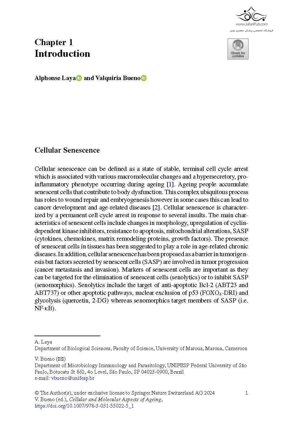این فرضیه که پیری و اختلال عملکرد ارگانیسم تحت تأثیر تجمع سلول های پیر است، منشا آن های هیفلیک و مورهد از فیبروبلاست های کشت شده انسانی است. نشان داده شد که فیبروبلاست ها ظرفیت محدودی را برای تکثیر ارائه می دهند و در نتیجه به حالت توقف رشد برگشت ناپذیر (پیری همانندسازی) می رسند. در سال 2011، ون دیوزن و همکاران. نشان داد که تجمع p16Ink4a با پیری زودرس در مدل موش همراه بود و غیرفعال شدن ژن p16Ink4a فنوتیپ پیری را کاهش داد. بنابراین، توقف چرخه سلولی به دلیل بیان p16Ink4a و p21CIP (بازدارنده های چرخه سلولی) مشخصه اصلی پیری است. علاوه بر پیری سلولی، علائم بارز پیری شامل بی ثباتی ژنومی، کوتاه شدن تلومر، تغییرات اپی ژنتیکی، از دست دادن پروتئوستاز، عدم تنظیم حس مواد مغذی، اختلال عملکرد میتوکندری، فرسودگی سلول های بنیادی، تغییر ارتباطات بین سلولی، و ترشحات پیش التهابی SP می باشد. در این کتاب، محققان به طور جامع تغییرات مربوطه را که در سطوح سلولی و مولکولی (مدل های انسانی و حیوانی) بر اساس ویژگی های بارز پیری رخ می دهد، مورد بحث قرار خواهند داد. تاثیر سبک زندگی و فواید فعالیت بدنی و تغذیه نیز مورد بحث قرار خواهد گرفت. کشف جنبه های سلولی و مولکولی پیری برای پرسش های بی پاسخ در مورد پیری و برای مداخلات راهنمایی مانند تغییر در شیوه زندگی، درمان های سنولیتیک (سلول های پیر را می کشد) و سنومورفیک (قطع کننده ارتباطات مضر بین سلولی) بسیار مهم است.
