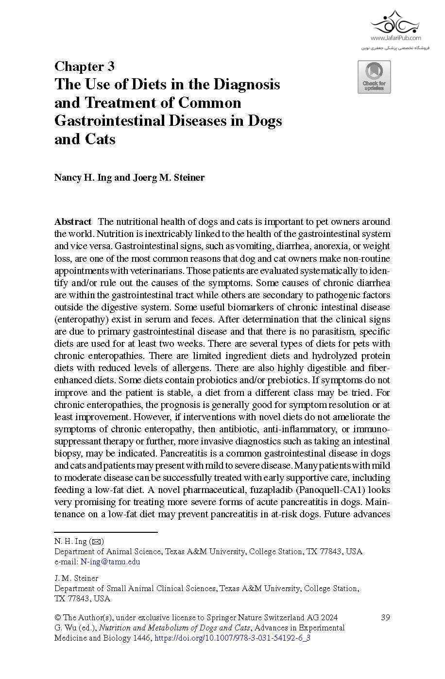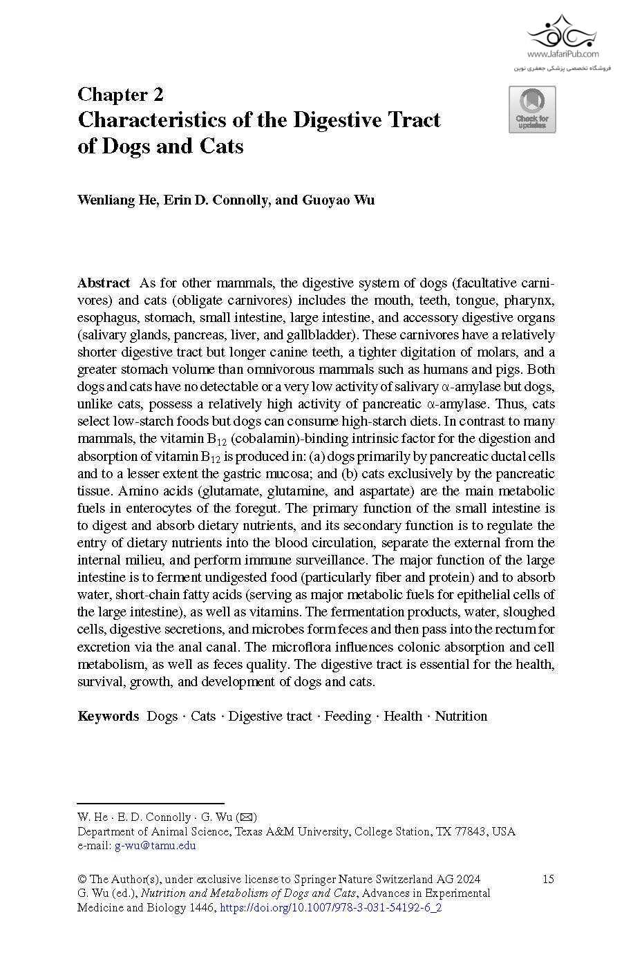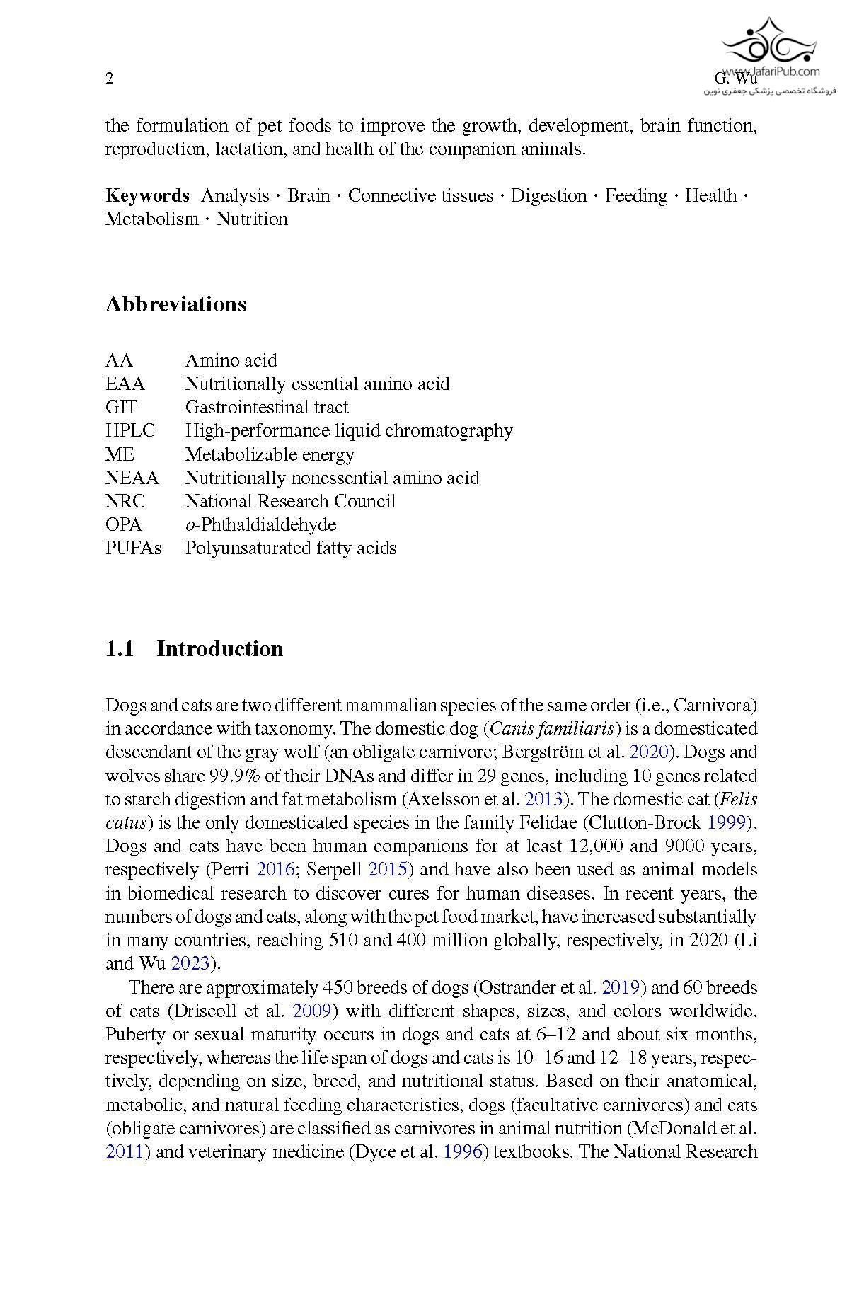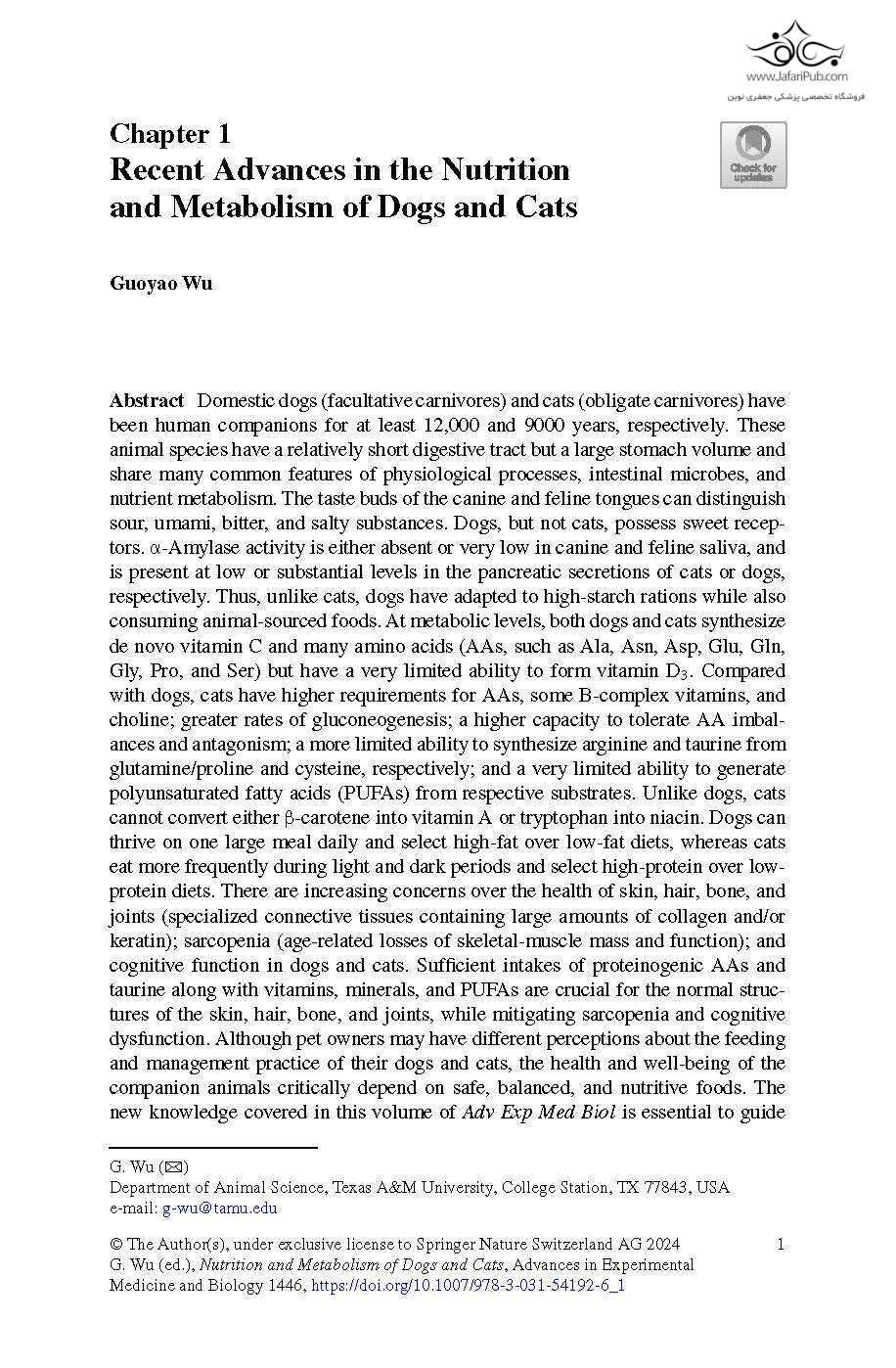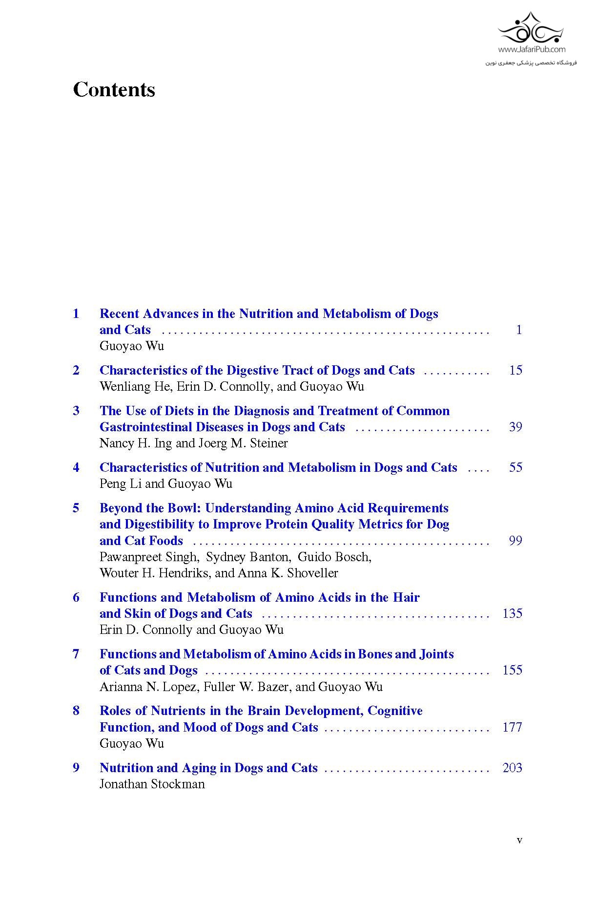 این کتاب دانش جدیدی در مورد تغذیه و متابولیسم و همچنین نقش مواد مغذی در ایمنی، سلامت و مدیریت حیوانات همراه (سگ و گربه) ارائه می کند. سگ خانگی (گوشتخوار اختیاری) و گربه خانگی (گوشتخوار واجب) در دستگاه گوارش، تغذیه، متابولیسم، حس شیمیایی و رفتار تغذیه خود به طور متفاوتی تکامل یافته اند. این حیوانات به ترتیب برای حداقل 12000 و 9000 سال همراه انسان بوده اند و همچنان به سلامت روان و رفاه کودکان، نوجوانان و بزرگسالان کمک می کنند. سگ ها و گربه ها در دهه های گذشته در بسیاری از کشورها و در سراسر جهان به طور فزاینده ای محبوب شده اند. به روز رسانی جامع در مورد نحوه استفاده حیوانات از مواد مغذی غذایی برای رشد، توسعه و سلامت مطلوب برای صاحبان آنها و همچنین دانشجویان و محققان مفید است.