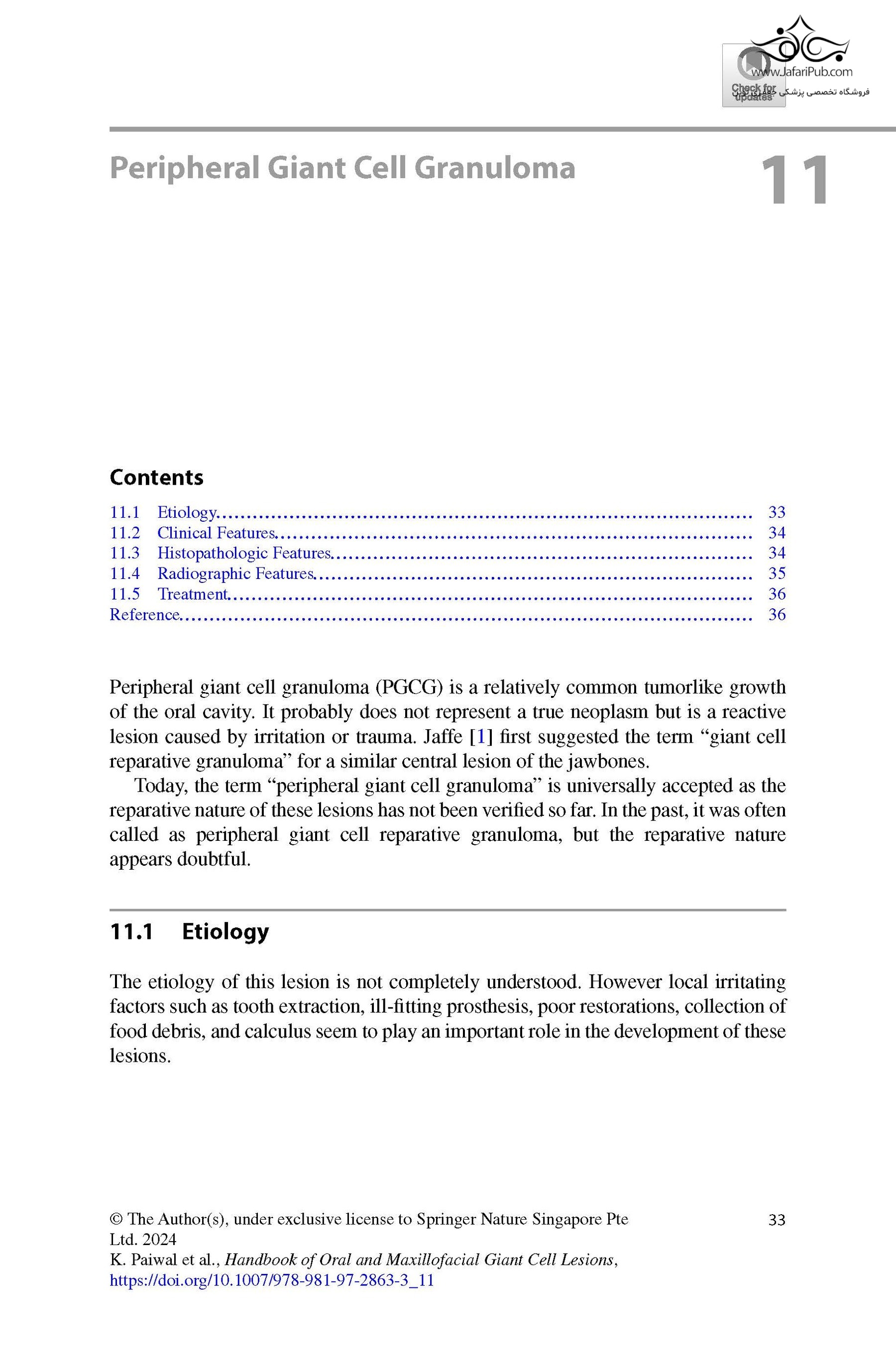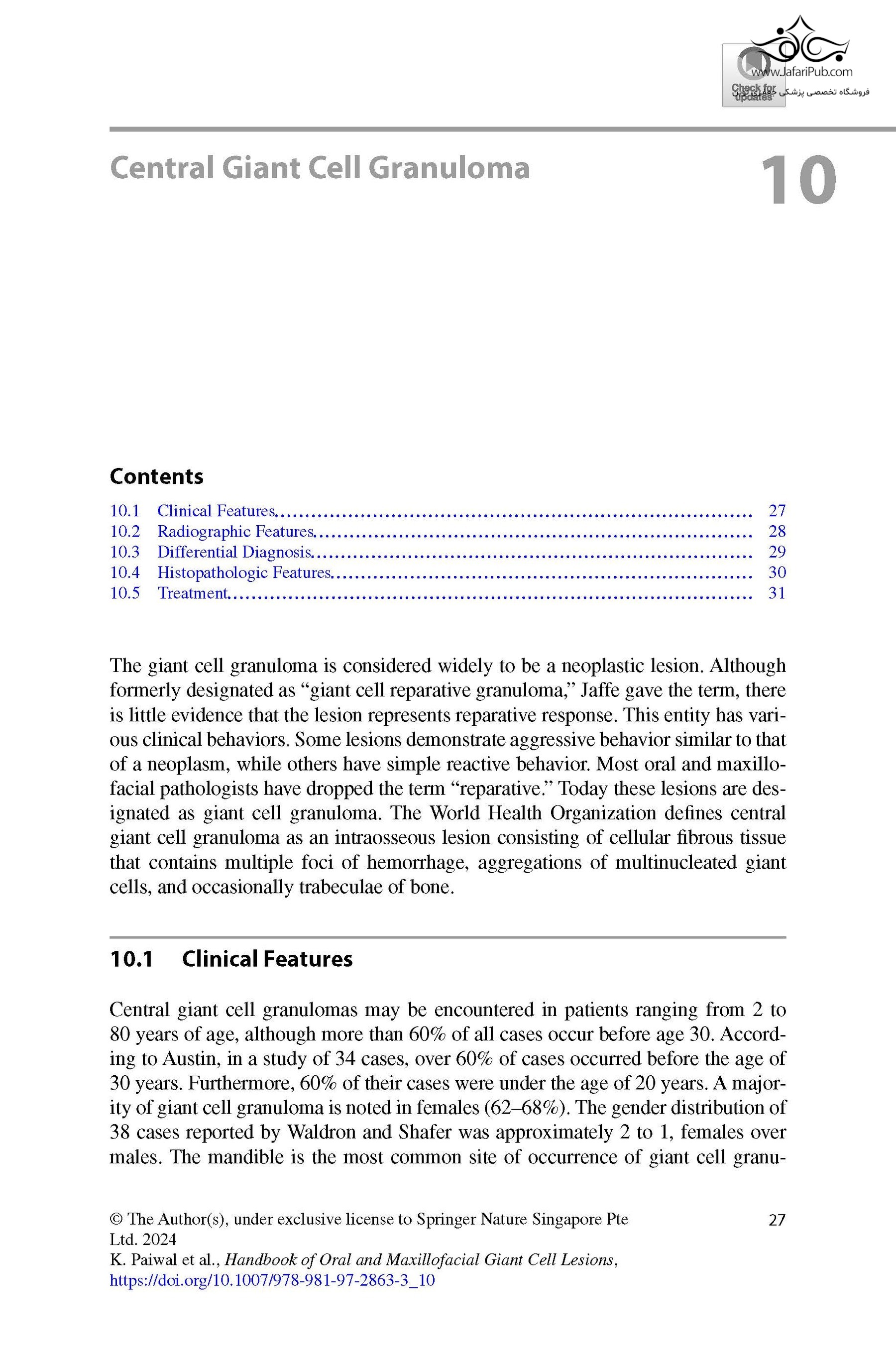 The book covers all the oral and maxillofacial lesions which contain giant cells, either as a pathognomonic feature or otherwise. It includes different types of giant cells (i.e. physiological, inflammatory and tumorigenic) followed by four ways of classification. The book provides a detailed description of the lesions along with differential diagnoses for the ease of appropriate diagnosis.