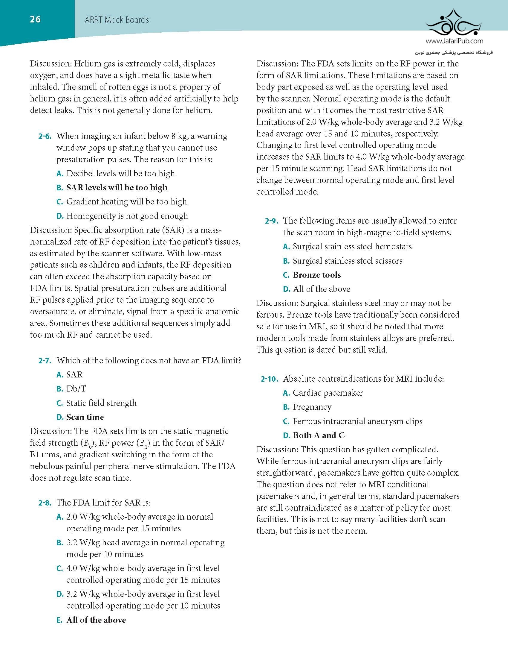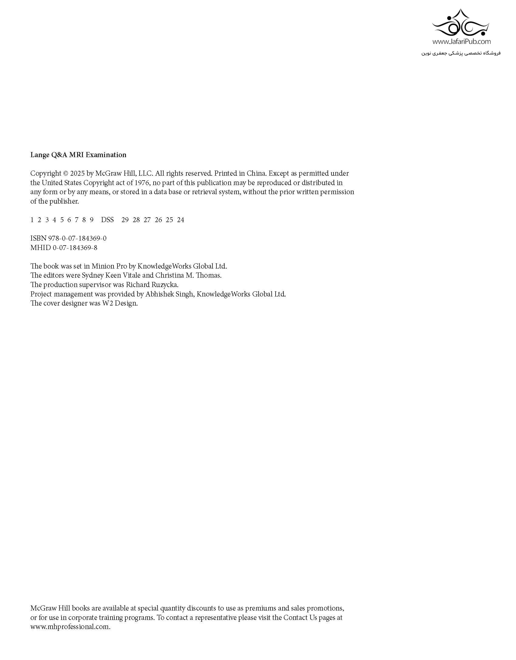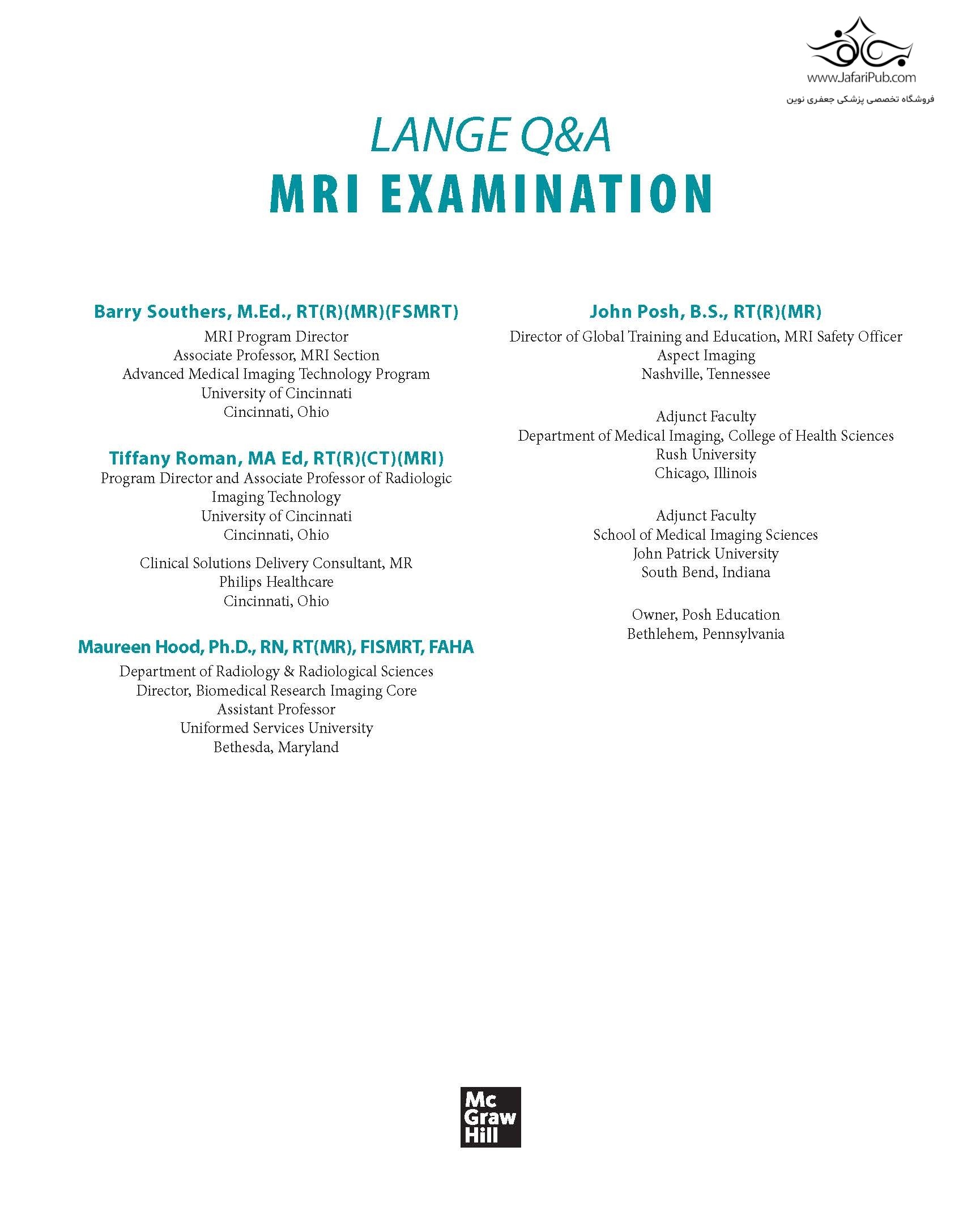 آزمون MRI پرسش و پاسخ LANGE™ یک بررسی جامع برای تکنسین های رادیولوژی است که خود را برای شرکت در آزمون گواهینامه تخصصی ARRT® در تصویربرداری تشدید مغناطیسی (MRI) آماده می کنند. خوانندگان بیش از ۸۰۰ سوال به سبک آزمون را خواهند یافت که دقیقاً از جدیدترین طرح آزمون ARRT® پیروی می کنند. هر سوال شامل توضیح مفصلی برای گزینه های پاسخ صحیح و نادرست است.