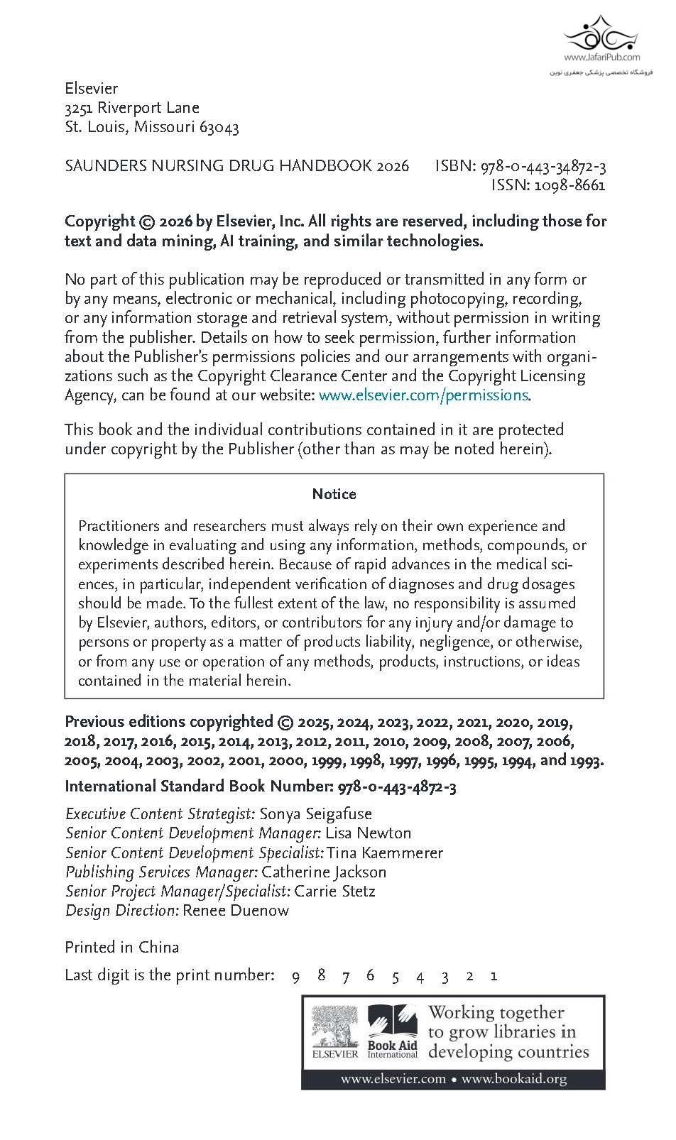سوالات متداول در مورد خرید کتاب Saunders Nursing Drug Handbook 2026 قیمت این کتاب چقدر است؟ قیمت این کتاب بسته به نوع جلد و نسخه متفاوت است و از 5,016,000 تومان شروع می شود. در حال حاضر با تخفیف 4,514,000 تومان عرضه می شود. این کتاب چه زمانی به دستم می رسد؟ برای کتاب های انگلیسی یا لاتین، زمان تحویل بین 3 تا 6 روز کاری است.