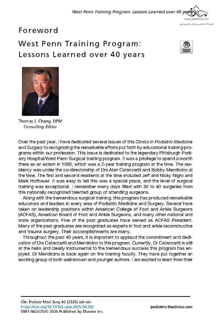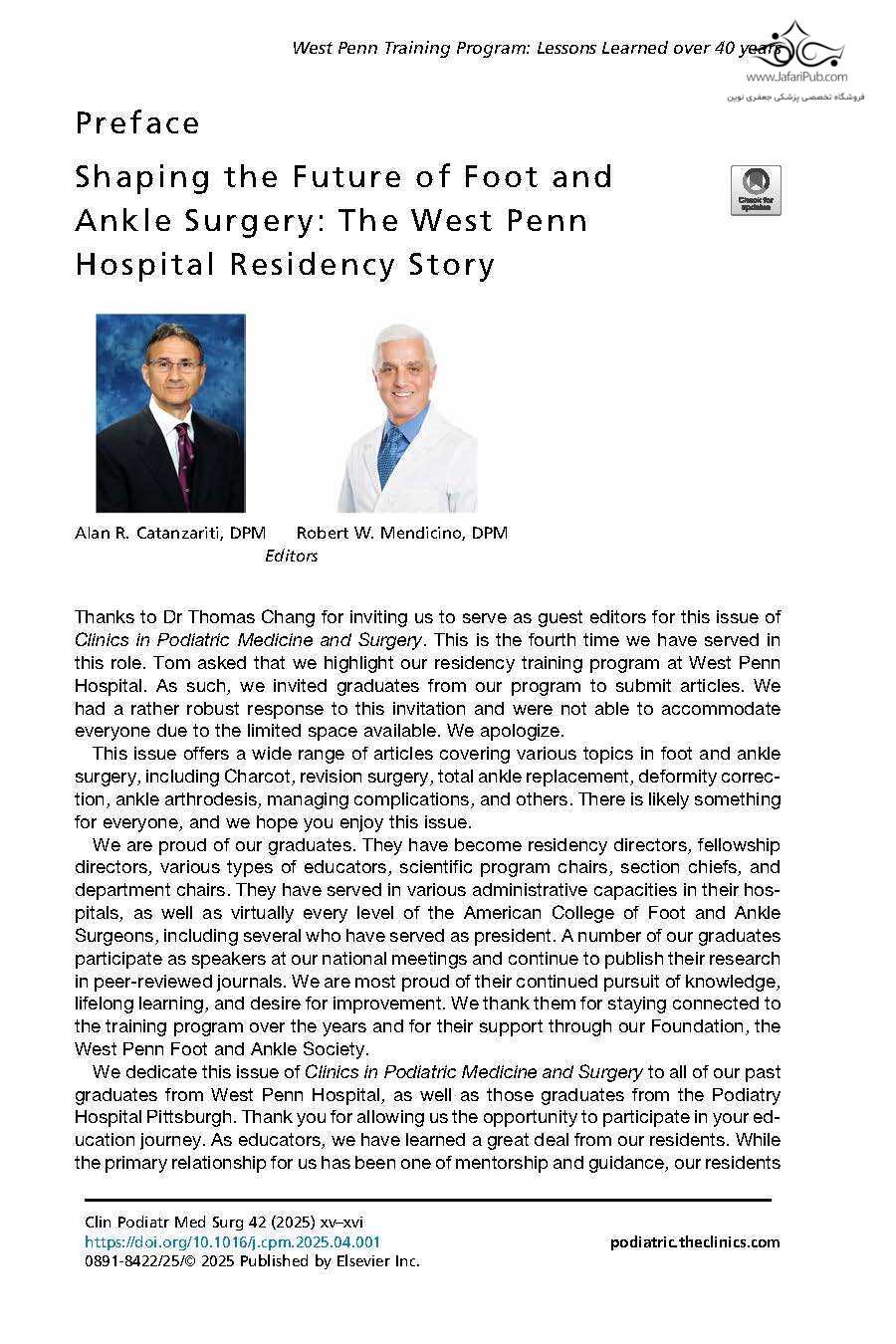 In this issue of Clinics in Podiatric Medicine and Surgery, guest editors Drs. Alan Catanzariti and Robert Mendicino bring their considerable expertise to the topic of West Penn Training Program: Lessons Learned Over 40 Years. This issue is written by graduates of the West Penn Hospital residency program, and serves as a testament to the importance of rigorous academic training that instills the habits of life-long learning and critical self-analysis.