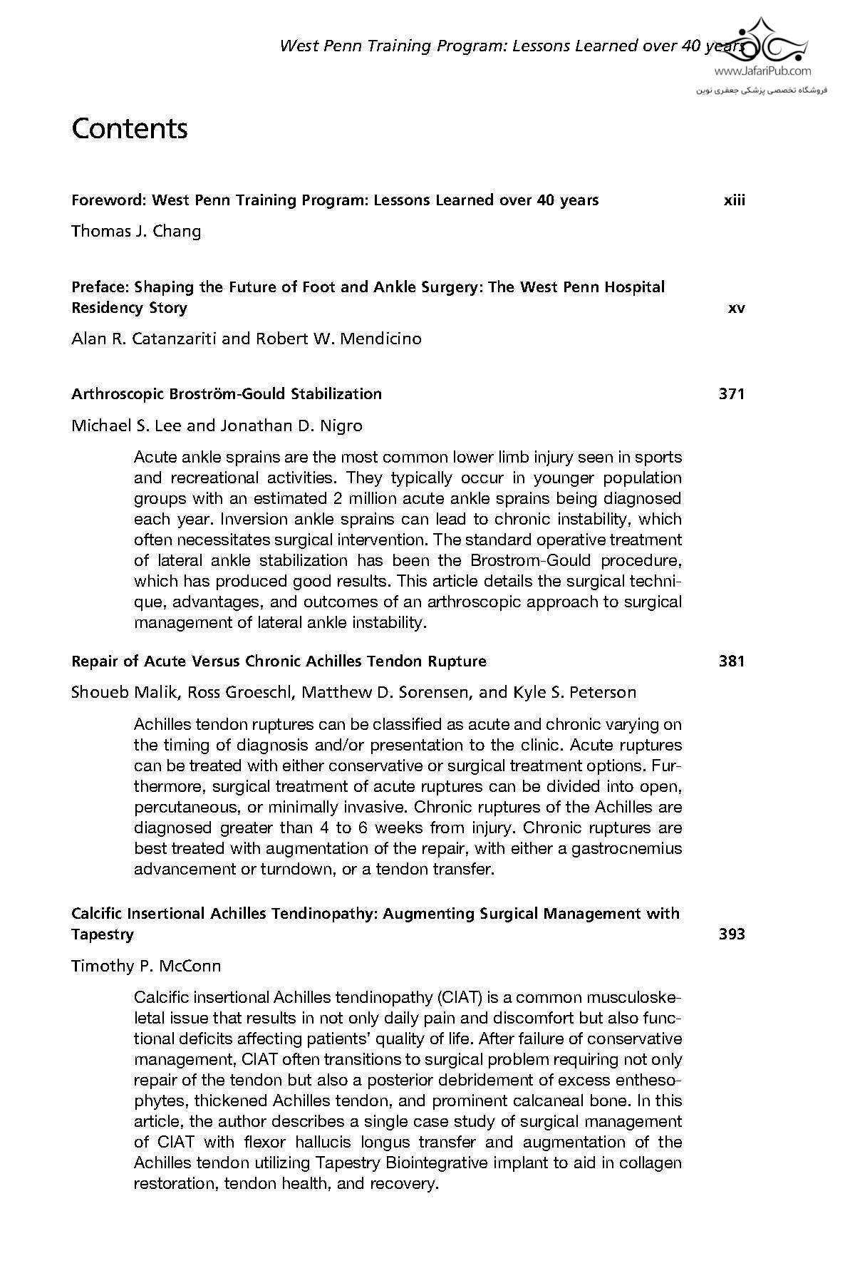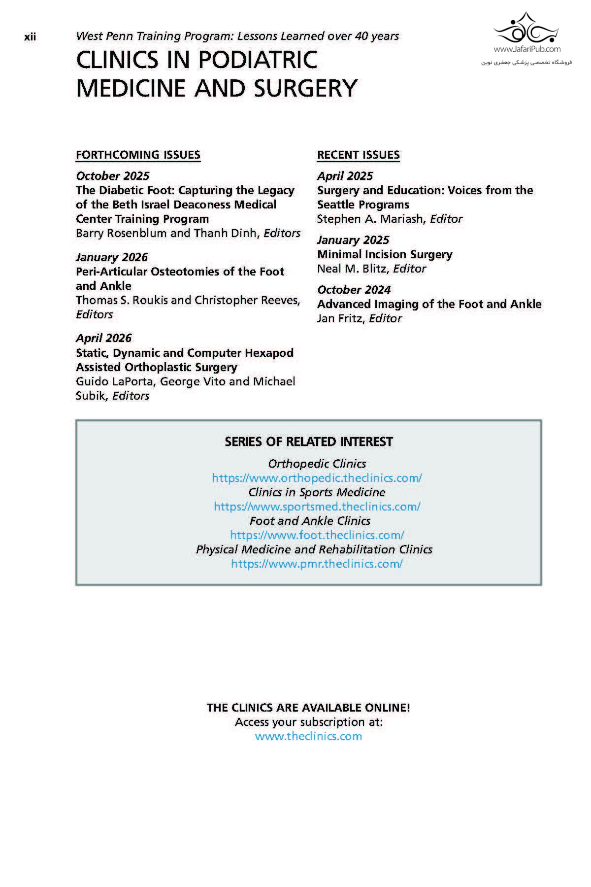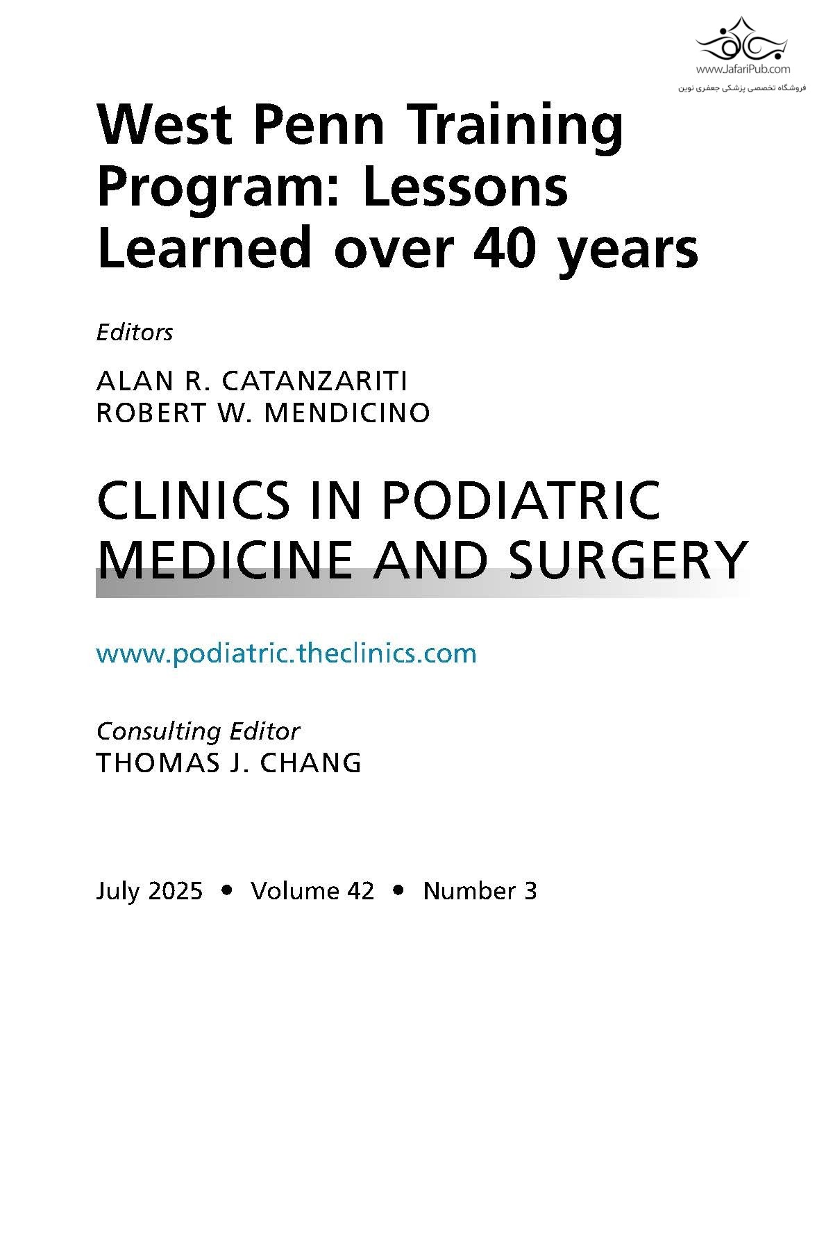در این شماره از کلینیک های پزشکی و جراحی پا، ویراستاران مهمان دکتر آلن کاتانزاریتی و رابرت مندیچینو تخصص قابل توجه خود را در موضوع «برنامه آموزشی وست پن: درس های آموخته شده طی ۴۰ سال» ارائه می دهند. این شماره توسط فارغ التحصیلان برنامه رزیدنتی بیمارستان وست پن نوشته شده است و گواهی بر اهمیت آموزش آکادمیک دقیق است که عادات یادگیری مادام العمر و خودکاوی انتقادی را القا می کند.